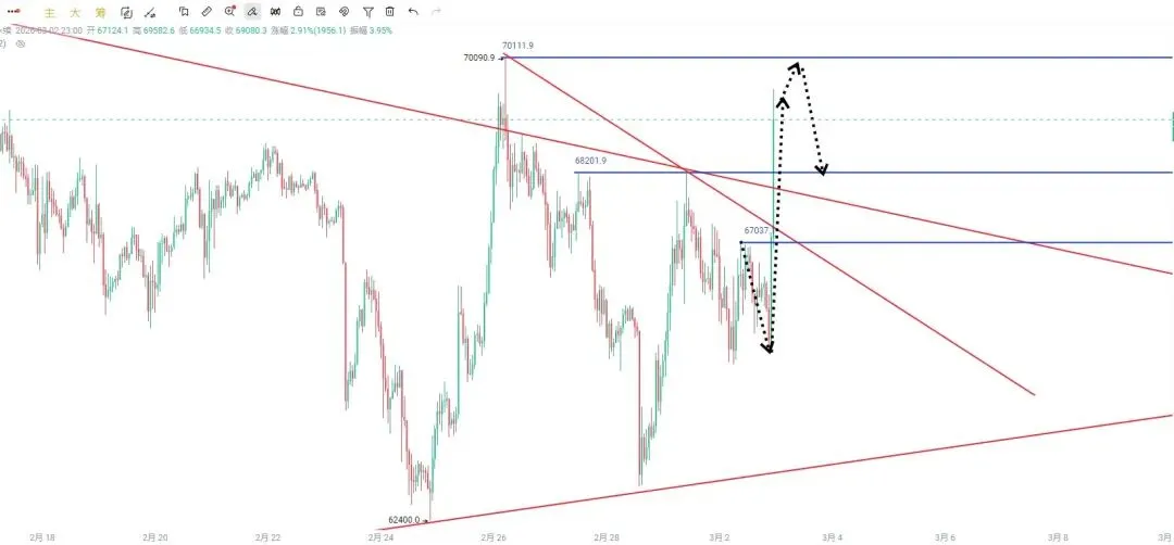 关键分水岭:若价格无法有效突破并企稳于70000美元上方,则整体格局仍视为宽幅震荡。反之,一旦确认上破,将打开新的上行空间。
