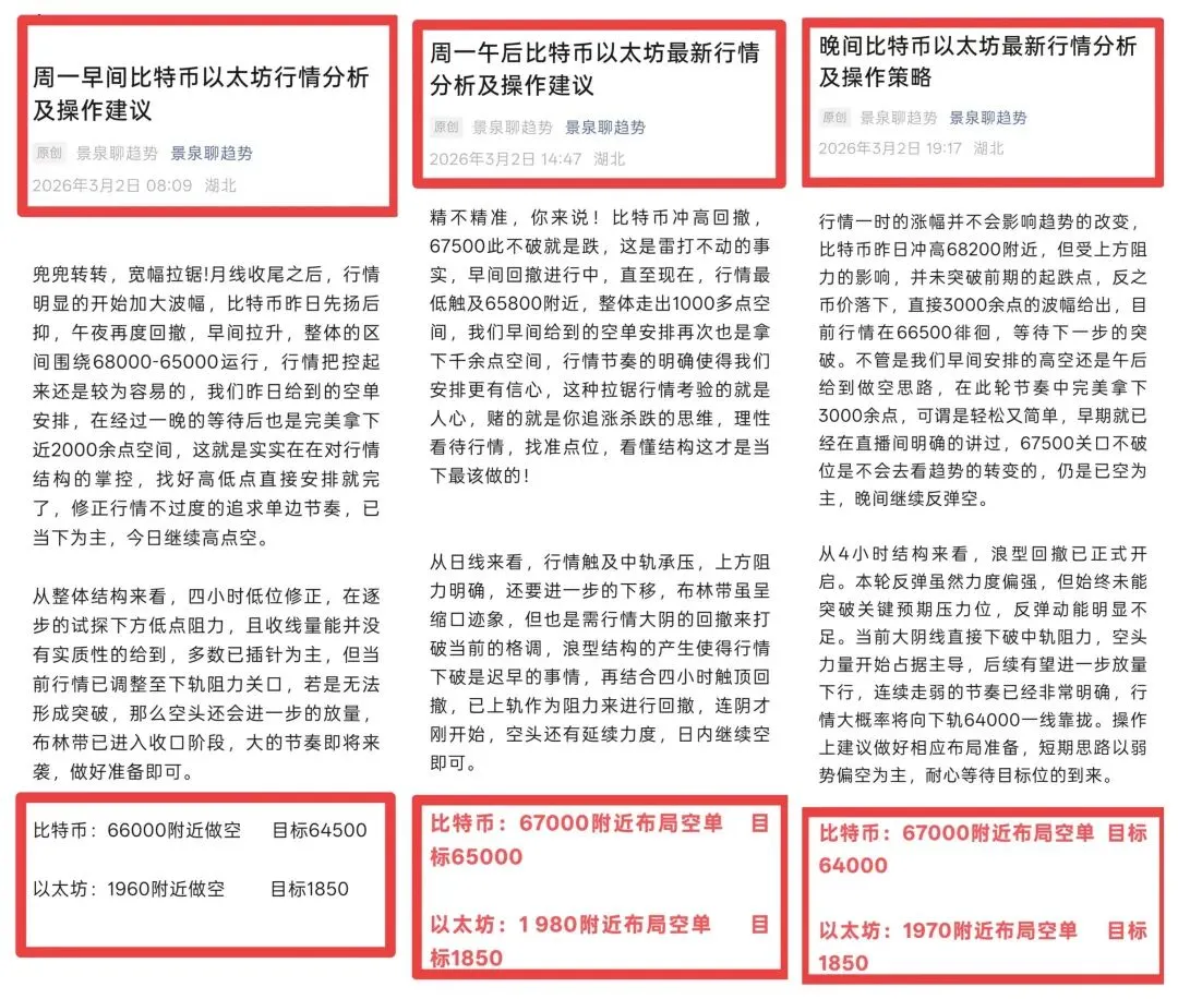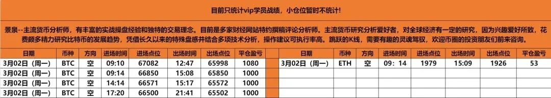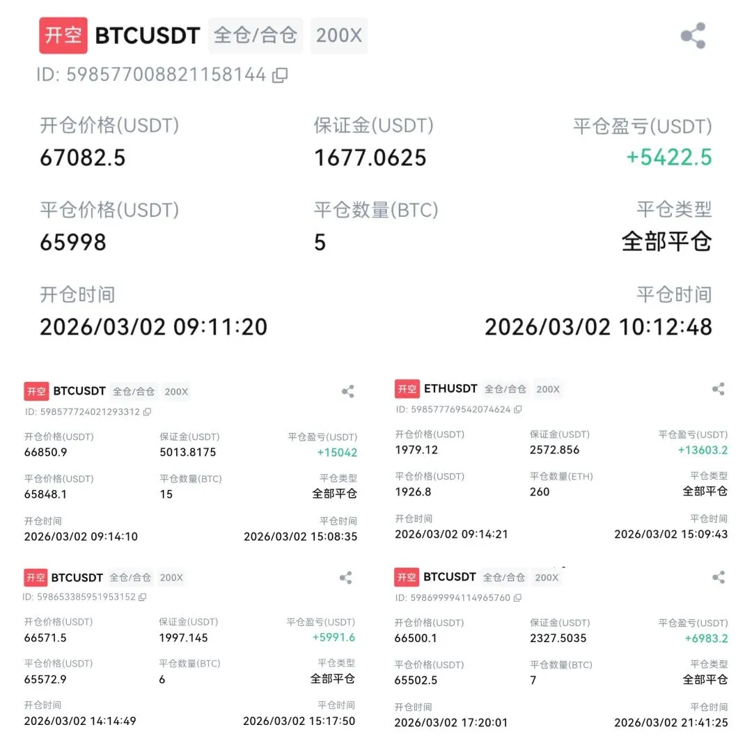 起飞咯,又是多空狂欢的一天!日内白盘币价最低来到了65234一线,但到了晚间受美股开盘影响币价自65234低位一路上行直到当前最高来到了69686点附近,以太坊则保持着和比特币相同走法自1919低位开始上探直到晚间同样走出了一波强势反弹趋势最高来到了2076一线,日内白盘景泉看空思路精准预判,日内景泉布局5单分别是比特币4单以太坊一单:比特币4单共计斩获4000多点空间,以太坊斩获53点空间。