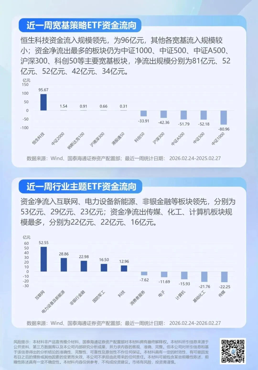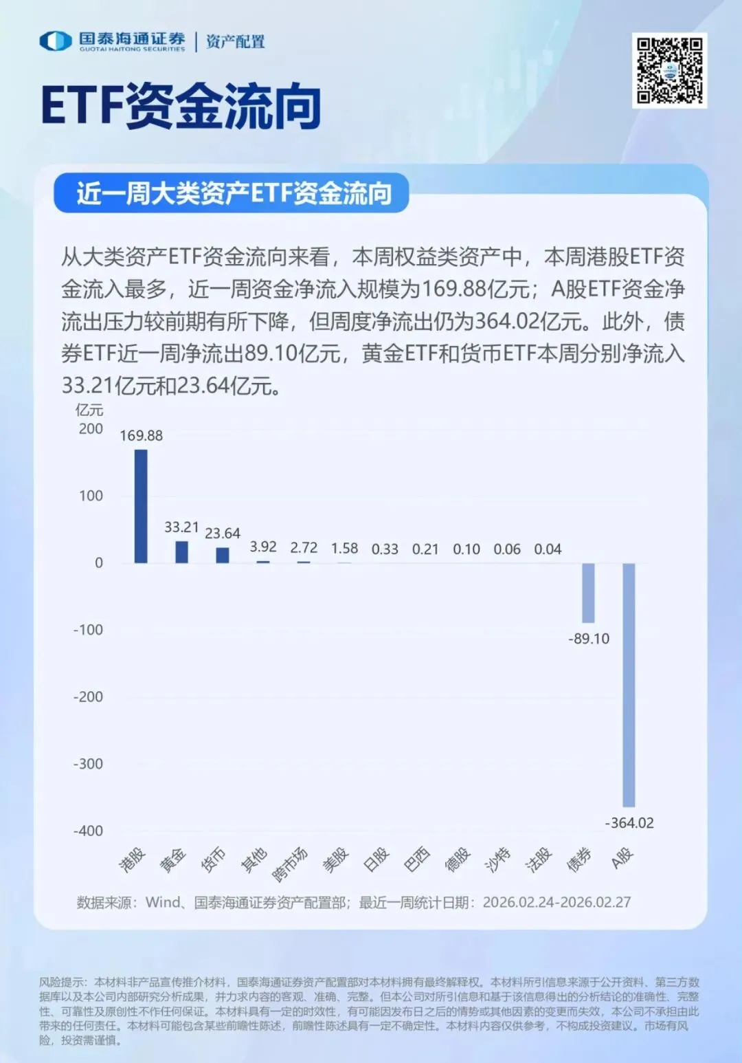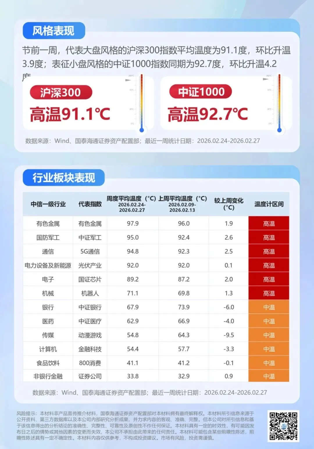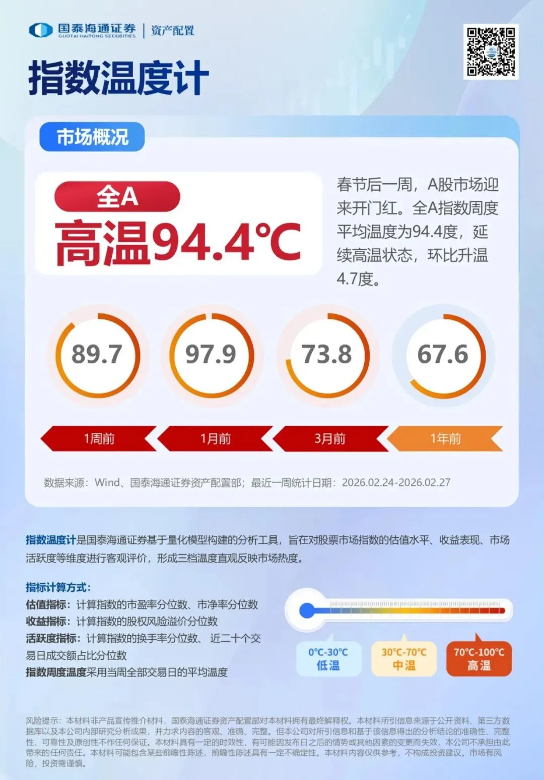 春节后一周,A股市场迎来开门红。全A指数周度平均温度为94.4度,延续高温状态,但ETF资金总体净流出。近日中东局势突变,油价快速拉升,金价跳涨突破阶段性高位。全球风偏波动加大,国内两会召开在即,继续重视周期红利的配置价值。