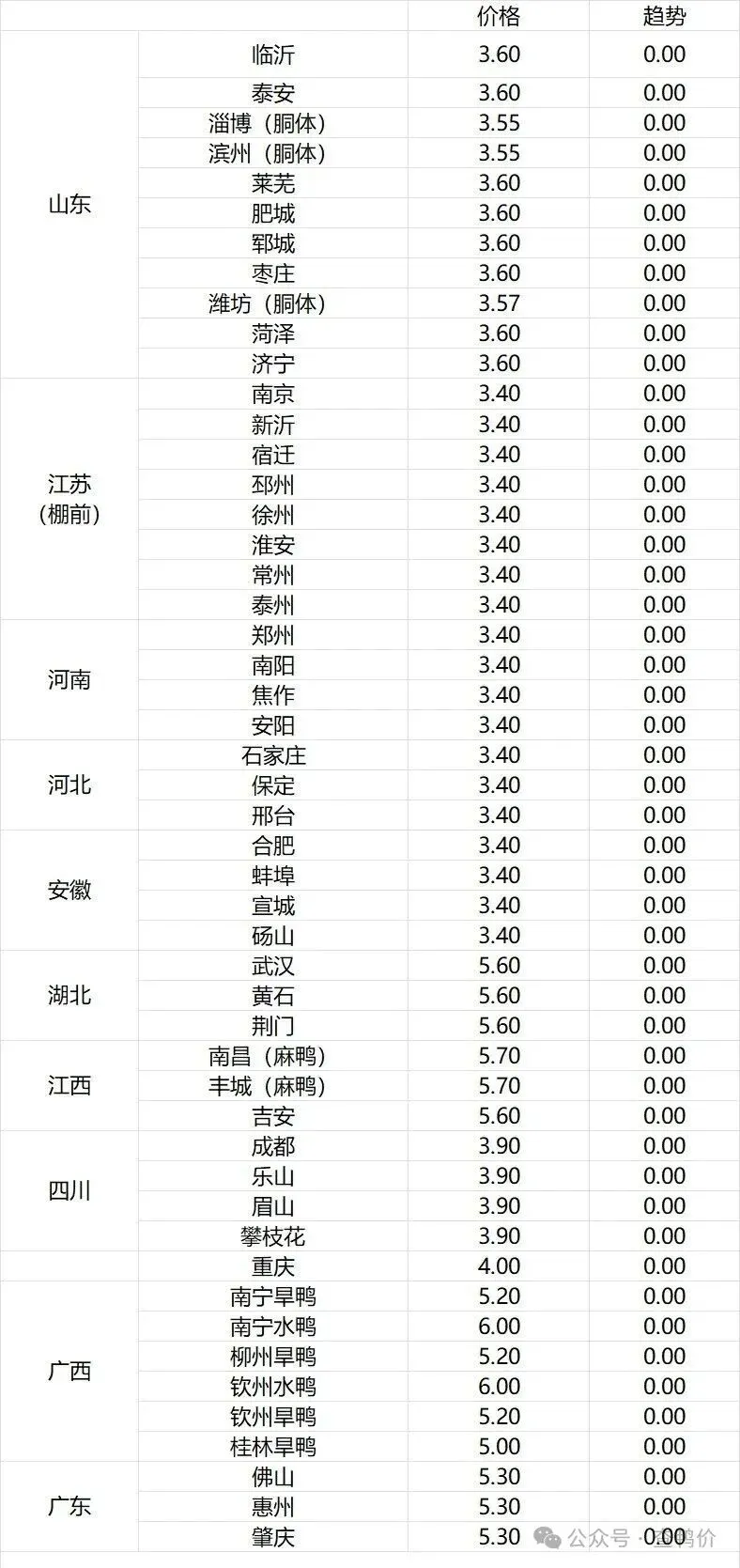 微评:鸭苗报价下跌。(注:南方只报当天价格)市场情绪一般,交投平淡,根据产品、养殖成本及鸭苗现状分析,预计近期鸭苗价格呈震荡下行趋势。种蛋报价落1毛。温馨提示:该价格为主流厂家报价,实际销售价格以成交价格为准,价格仅供参考。