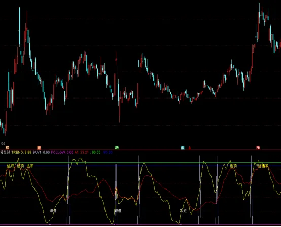 第三层是关键信号提示,这层最实用!短期趋势线往上走,碰到50的时候,会有粉色标记,是值得关注的信号;碰到7的时候,会显示“跟进”,适合新手试探性关注。