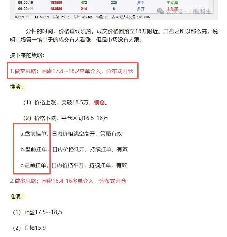 1.做空思路:围绕17.8--18.2空单介入,分布式开仓 推演: (1)价格上涨,突破18.5万,锁仓。 (2)价格下跌,平仓区间16.5-16万. a.盘前挂单,日内价格跳空高开,策略有效 b.盘前挂单,日内价格低开,持续挂单,有效 c.盘前挂单,日内价格平开,持续挂单,有效 2.做多思路:围绕16.4-16多单介入,分布式开仓 推演: (1)止盈17.5--18万 (2)止损15.9