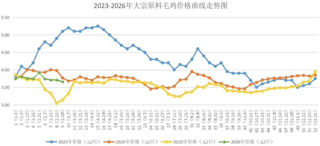 本周毛鸡均价3.66元/斤,较上周(3.71元/斤)下跌0.05元/斤,环比下跌1.35%;较2025年同期(3.14元/斤)上涨16.56%;较2024年同期(3.77元/斤)下跌2.92%;较2023年同期(5.10元/斤)下跌28.24%。山东地区毛鸡价格3.50-3.60元/斤,东北地区毛鸡价格3.70-3.80元/斤。 本周是春节放假后的第一周,前半周市场交易没有开始,后半周主产区屠宰企业企业没有全面开宰,而鸡源供应相对充足,成交较差,毛鸡价格出现下行趋势。