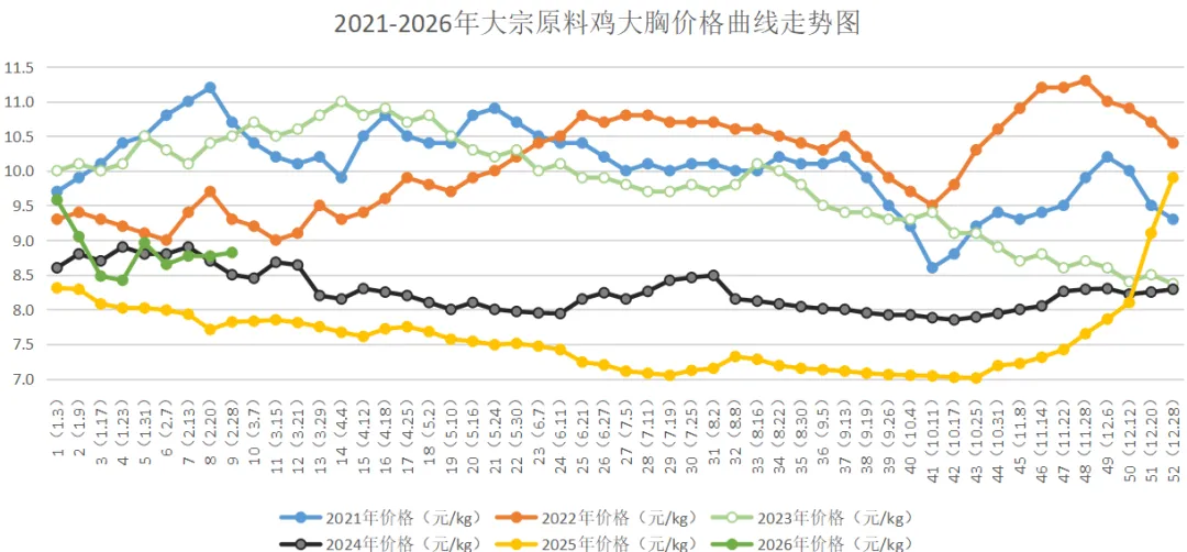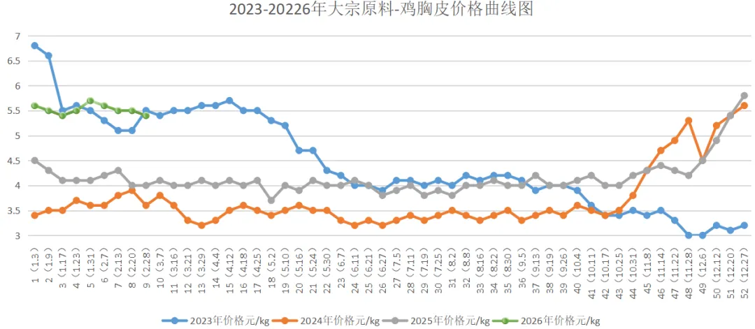 双汇标准原料板冻大胸本周均价8.82元/kg,较上周8.77元/kg上涨0.31元/kg,环比上涨0.57%;较2025年同期(7.82元/kg)上涨12.79%;较2024年同期(8.50元/kg)上涨3.76%;较2023年同期(10.50元/kg)下跌16.0%;较2022年同期(9.30元/kg)下跌5.16%;较2021年同期(10.70元/kg)下跌20.12%。3、鸡胸皮