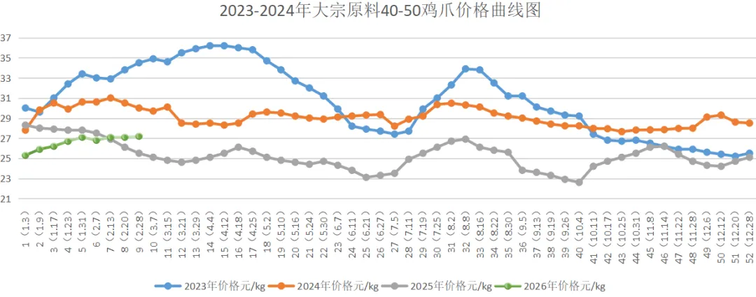 双汇标准原料鸡胸皮本周均价5.40/kg,较上周5.50元/kg下跌0.10元/kg,环比下跌1.82%;较2025年同期(4.00元/kg)上涨35.0%;较2024年同期(3.60元/kg)上涨50.0%;较2023年同期(5.50元/kg)上涨1.82%。4、40-50鸡爪