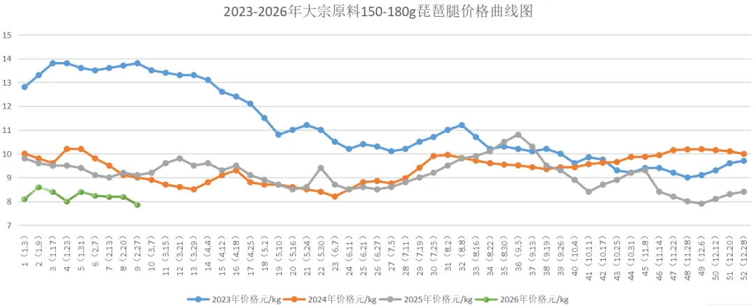 150以上琵琶腿本周均价7.86/kg,较上周8.18元/kg下跌0.32元/kg,环比下跌3.91%;较2025年同期(9.10元/kg)下跌13.63%;较2024年同期(9.0元/kg)下跌12.67%;较2023年同期(13.80元/kg)下跌43.04%。