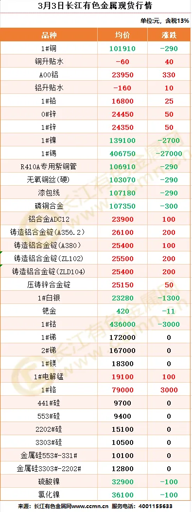 >3月3日长江有色金属现货行情