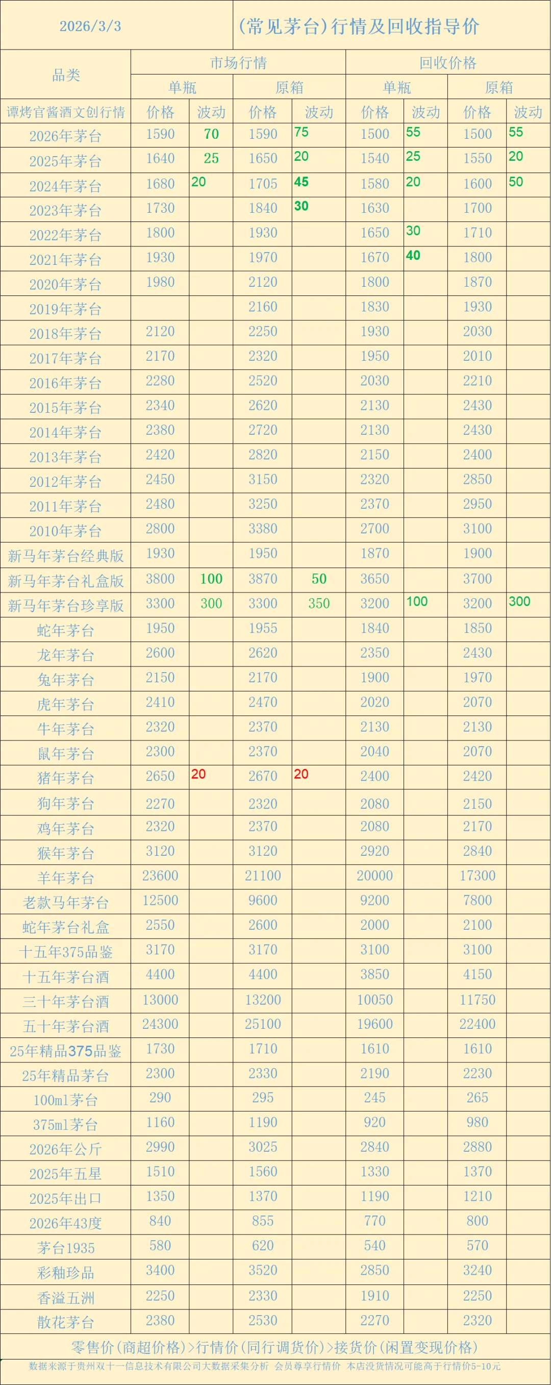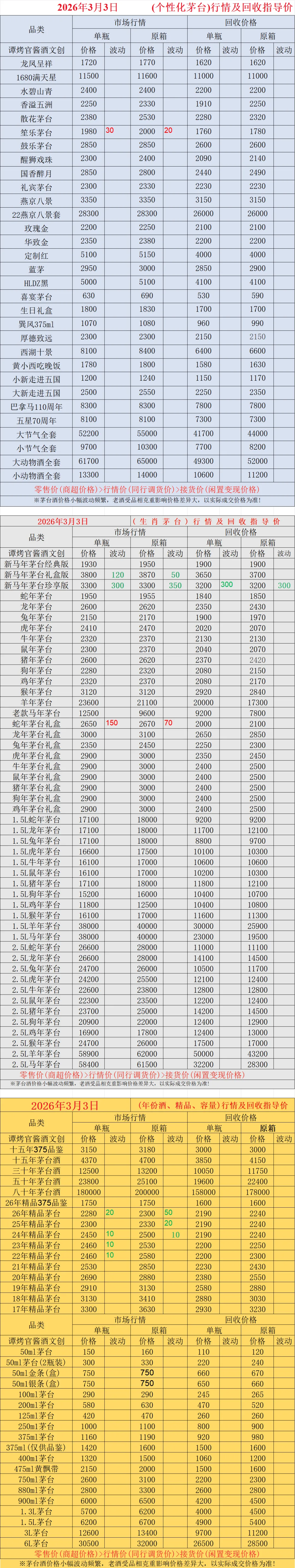 今天是2026年3月3日星期二,与昨日行情相比:常规茅台中:2026年飞天原箱6瓶装、2026年飞天散瓶、2025年飞天原箱6瓶装、2025年飞天散瓶、2024年飞天原箱6瓶装、2024年飞天散瓶、2023年飞天原箱、十五年年份酒下跌;生肖茅台中:丙午马年礼盒装、丙午马年珍享版下跌;蛇年375ml礼盒、猪年生肖原箱上涨;文创个性化茅台中:笙乐飞天上涨,回收参考价常规茅台中:2026年茅台原箱和散瓶、2025年原箱和散瓶、2024年茅台原箱和散瓶、2022年茅台散瓶、2021年茅台散瓶、2026年精品茅台原箱和散瓶、2025年精品茅台原箱、2024年精品茅台原箱和散瓶、2023年精品茅台散瓶、2022年精品茅台散瓶跌价,生肖茅台中:珍享版马年原箱和散瓶跌价。