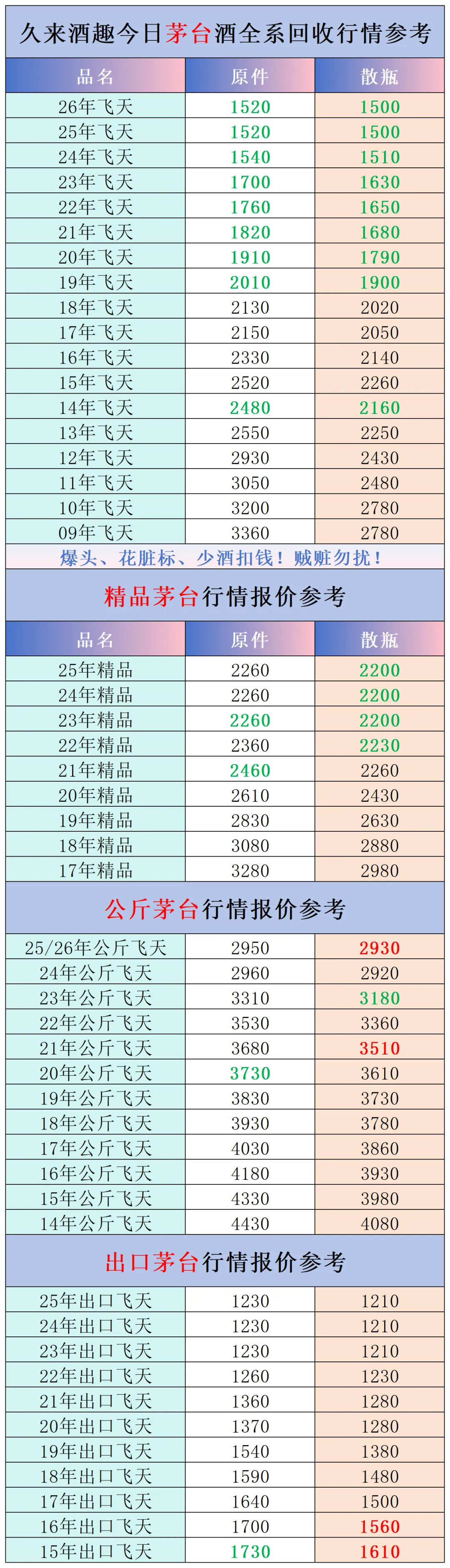 本公众号提供各种名酒回收行情报价,常规茅台、五粮液、洋河、剑南春、国缘等。所有报价根据市场买卖行情总结而来,每天更新最新报价!部分酒水每天涨跌幅较大,无法及时更新请谅解。本报价仅供参考,并非实际成交价格。感谢您的关注!我们会竭尽所能,提供更多更好的服务。