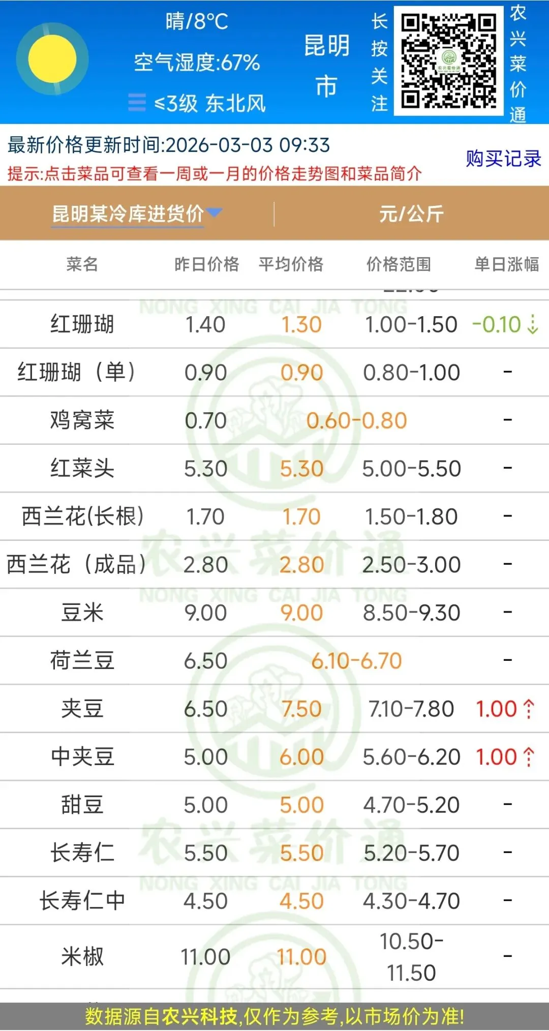 受到天气及开学季影响,南方市场稍有起色,对产区目前较为低迷的状态起到一定支撑作用。叶菜全线维稳,奶白近期开花速度越来越快,好货较少,货量一般,今日价位有所浮动,归于正常波动属性。小菜波动也不多,罗纹、茴香头、红珊瑚下滑,和需求不振有关。夹豆单天反弹,前期价位下跌,要货人稍多,小幅上涨。