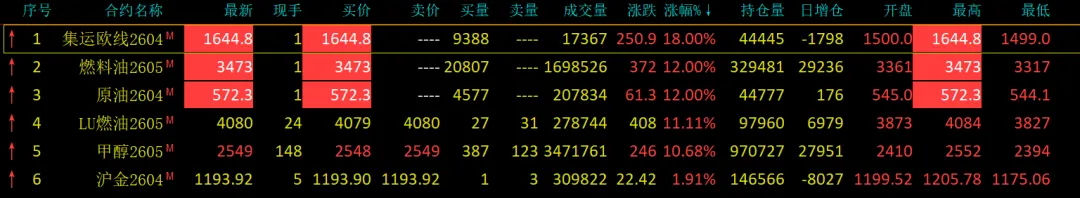 原油、燃油、甲醇、欧线持续涨停!贵金属全线大涨