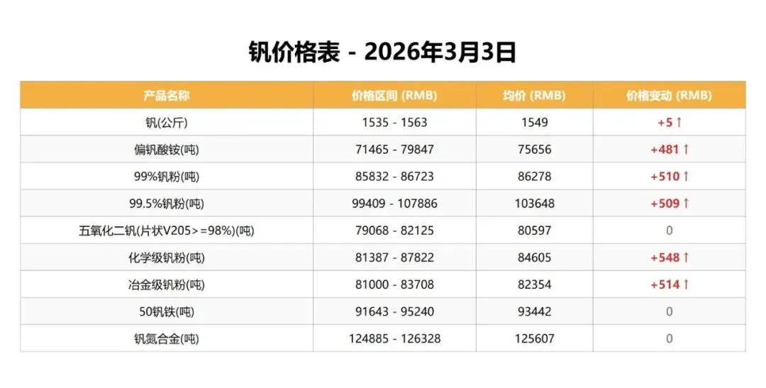 今日钛产品市场整体平稳,多数品类价格未变,仅锐钛型二氧化钛和氯化二氧化钛价格小幅上涨。钒产品市场涨跌互现,多数品类价格小幅上扬,但五氧化二钒、50钒铁和钒氮合金价格保持稳定。钒荣网旨在汇聚钒钛产业链上下游企业,钒荣网将通过资讯浏览推送、“双碳”产业、在线交易推广、技术成果转让、产业金融、钒产业指数、行业标准会议会展、咨询服务数据报告等功能板块,为钒储能上下游企业提供商机对接、行业资讯、产业金融、市场拓展、名企研学、品牌宣传、数据服务、专属顾问等服务。