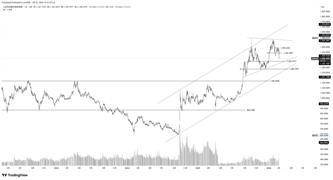 科创50,这个也是跟中证全指类似。这两天考虑如果能持续维持区间且向上突破就认为低点已经出来了。否则就还是维持原判:预期低点在1360附近。整体格局还是乐观,其实并没啥办法判断行情调整的形式。目前收敛三角形的预期也就是一个假设,只能说可以考虑逐步参与了。