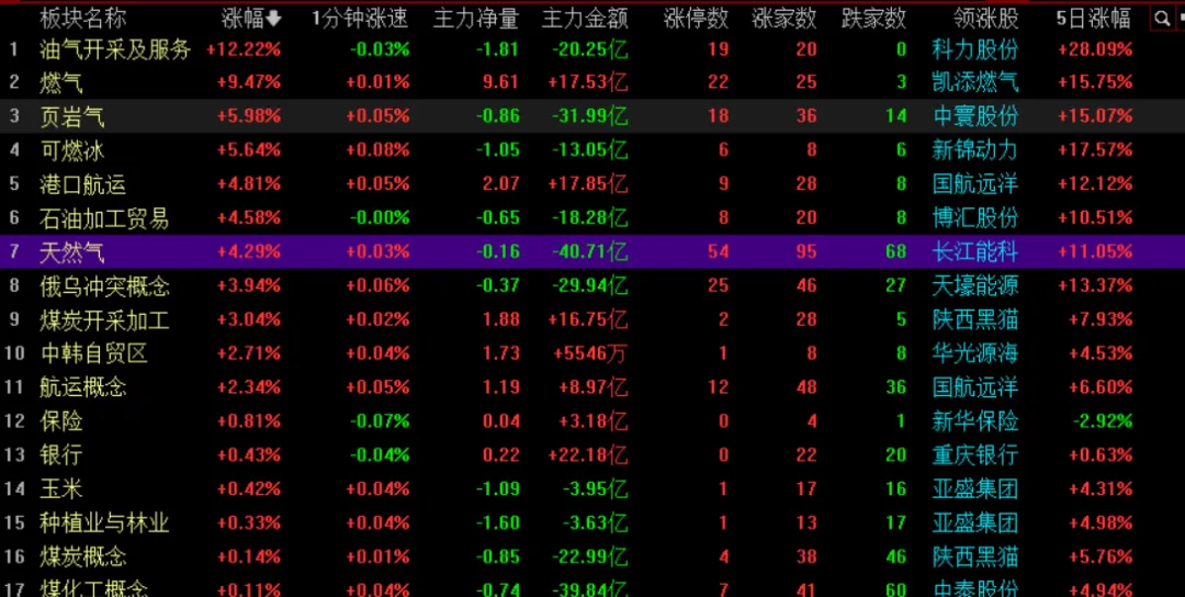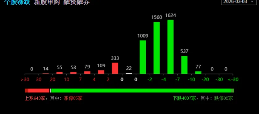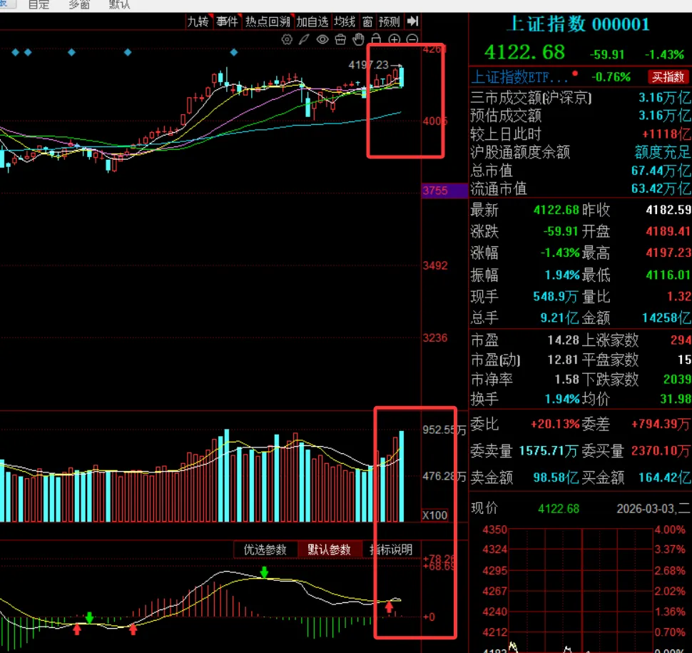 周二指数,沪指早盘高开低走,上午盘稍有反抽,午后开启单边下跌,三大股指齐跌,创业板指收跌2.57%,三桶油再次集体涨停,超4800家下跌。全天643家上涨,4807家下跌,91家涨幅超9%,137家涨幅超5%,225家跌幅超9%,1468家跌幅超5%,整体亏钱效应巨大。截止收盘,沪指收4122,68 跌1.43%,深成指收14022.39 跌3.07%,创业板指收3209.48 跌2.57%,科创指数收跌5.38%,两市成交3.12万亿。板块方面, 盘面 油气开采再次大涨12%,燃气,页岩气,可燃冰,港口,煤炭开采等涨幅居前,保险,银行,种业 避险属性品种领涨领跌方向 ,军备,工业金属,存储芯片,半导体等跌幅均超6%,其他行业跌幅基本超5%油气开采方向:科力股份30cm,通源石油,潜能恒信,首华燃气20cm,惠博普,中油工程,广汇能源,蓝焰控股,中海油服,贝肯能源,中国海油,中曼石油,博迈科,准油股份,海油工程,洲际油气,海油发展,新天然气涨停燃气:凯添燃气30cm,天壕能源,国新能源,深圳燃气,蓝天燃气,大众公用,佛燃能源,美能能源,洪通燃气,新澳股份,新疆火炬,皖天然气,东方环宇,成都燃气,贵州燃气,水发燃气,陕天然气,长春燃气,南京公用,万憬能源,胜利股份,重庆燃气,百川能源涨停港口航运:国航远洋30cm,中远海发,南京港,招商轮船,锦江航运,中远海能,宁波远洋,招商南油,宁波海运,中远海控,中远海特,招商港口涨停化工:中泰股份涨幅超14%,东方盛虹,新奥股份,中国石化,金牛化工,红星发展,金瑞矿业涨停受中东局势影响,整个亚太指数被笼罩在恐慌中,韩国综指盘中 直接触发熔断,当前跌幅达7.24%,日经指数也是大跌超3%,而恒生指数则是连续半个月下跌,A股今天冲高新高之后快速回落,大跌1.43%,日内振幅高达81点,超1400家个股大跌,4800家飘绿。亏钱效应明显。中证2000指数今日直接大跌4.16%,预计短期还有回踩迹象,散户亏钱因素跟这个也是有着直接性关系。技术,今日收取一根中阴柱,直接下穿5日,10日短期均线,依托于20日 30日中期均线,一旦跌破那么会有一个阶段性回调风险,量能则是放量回调,但不是所谓的天量,所以后续还需要继续维持一个观察思路。第一种:一旦跌破均线,那么短期可能会延续恐慌踩踏,4000-4100点将会是当前主要支撑;第二种:2-3日是否直接反包当前中阴柱,后市继续维持高位震荡。以上指数整体来说,对于散户主要是观察赚钱效应,中证2000不进行一个合理的止跌反弹也是没有太大作用的。题材行情则是更难指数角度,我认为更配合第一种,亏钱效应预计还会延续,然后再进行止跌企稳,周四开始进入两会周期,局部的消息将会占据板块的绝对地位,电风扇行情轮动加快,赚钱难度提升。而指数可能会围绕4100点震荡,大周期上开始震荡下跌,一直维持到4月份业绩月份,所以在交易思路上面也要改变改变,尽量做到低位埋伏模式。