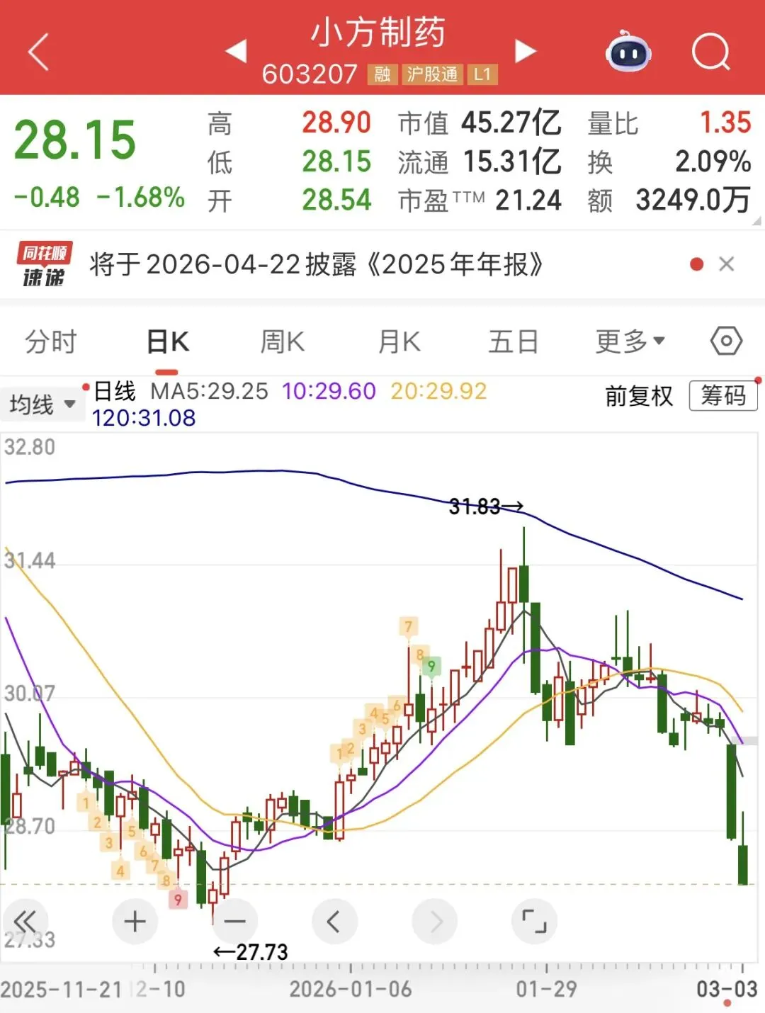 小方制药它属于次新股,它在2024年上市,而它也不出意外,上市就是巅峰,后面它的股价就是随着时间不断下跌和滑落。