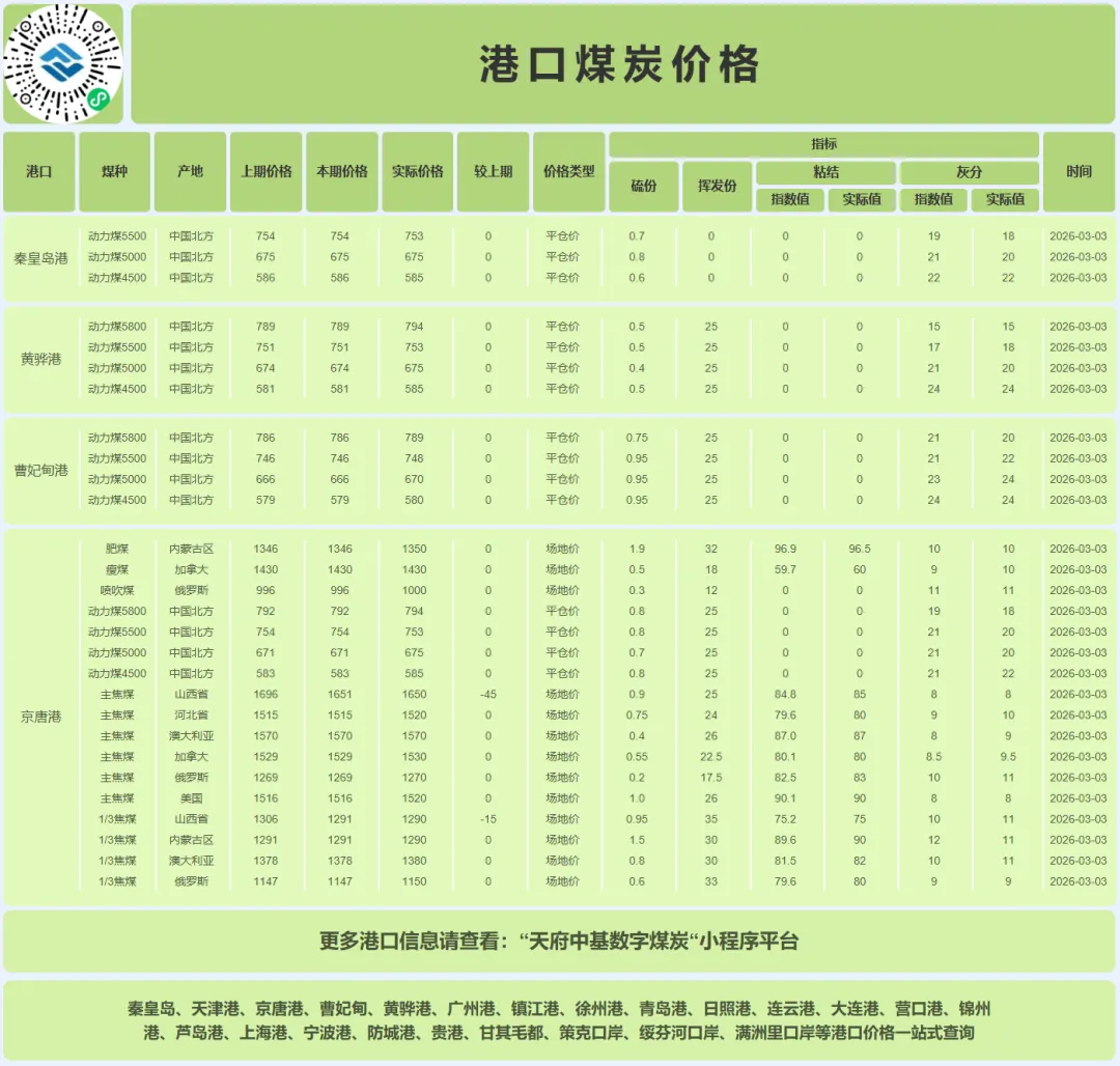 2026年3月3日,恰逢农历丙午年正月十五元宵节,国内动力煤市场呈现 “全价走平,高位均衡” 的典型休整态势。CCI指数显示,5500大卡、5000大卡及4500大卡动力煤价格分别持平于752元/吨、673元/吨和581元/吨。在节后经历连续上涨并触及阶段性高点后,市场进入暂时的价格平衡与方向抉择期,买卖双方在当前位置均表现出强烈的观望情绪。