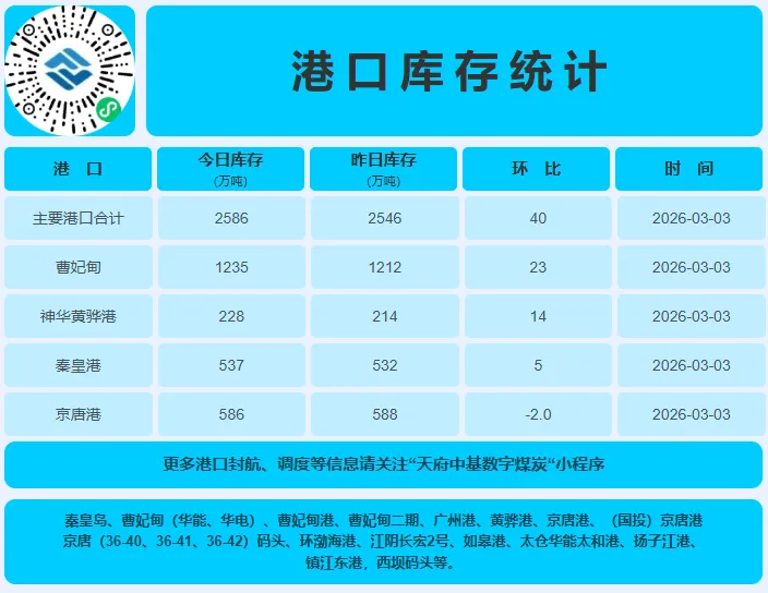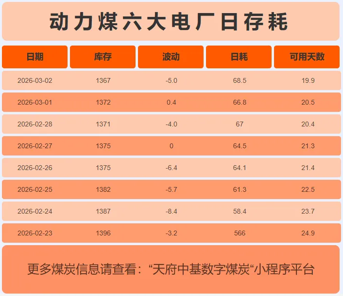 截至3月2日,沿海六大电厂日耗68.5吨,库存1367万吨,存煤可用天数约19.9天。