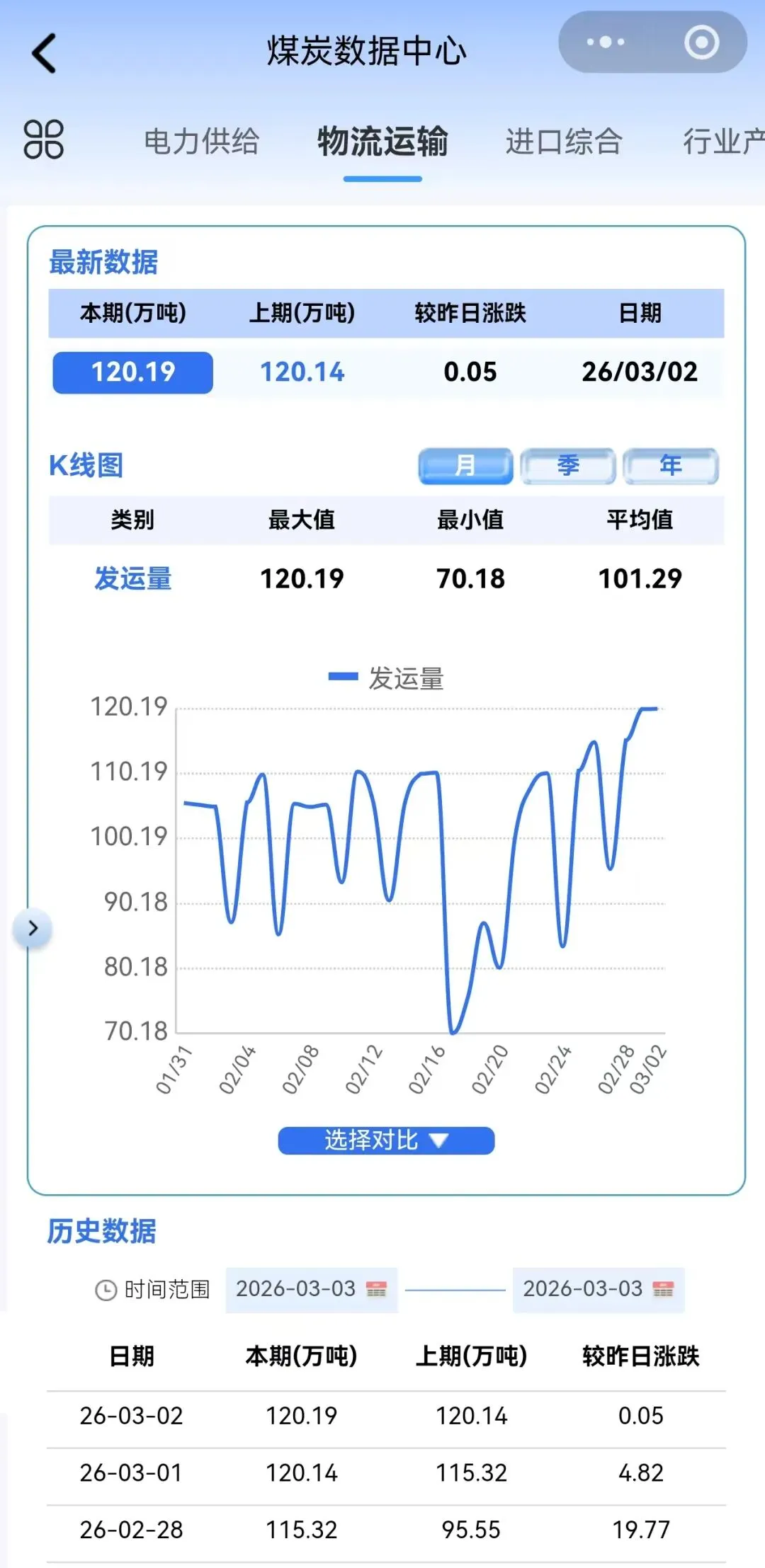 截至3月2日,大秦线日发运量为120.19万吨,较昨日上涨0.05万吨。