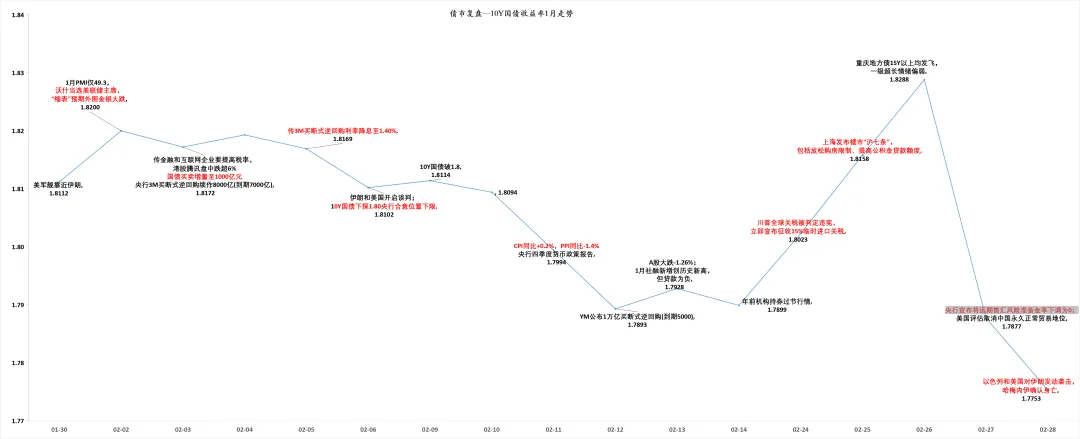 复盘2月债市行情,国内春节长假,消息面较为平淡,资金面宽松情况下机构持券过节意愿较强,债市利率稳步下行;春节后上海发布楼市“沪七条”(放松购房限制、提高公积金贷款额度),利率短暂反弹。但随着美伊战争爆发,市场避险情绪带动利率再度下行至1.80以下,突破ym合意位置下限。