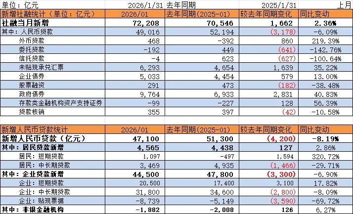 银行开门红效应下,1月新增社融7.22万亿创历史新高(较去年同期多增1662亿,主要靠政府债划支撑),但新增贷款结构一般,居民端和企业端贷款均呈现“中长贷向短贷转移”倾向。