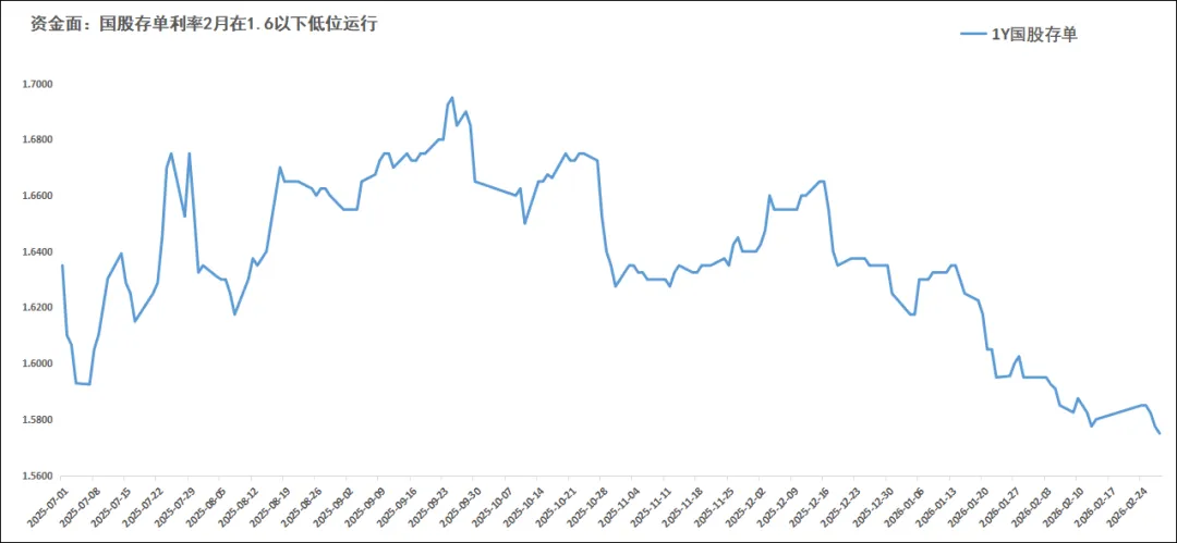 存单具有资金和债券投资的双重属性。1年国股存单2026年2月以来稳定在1.60下方运行。资金宽松,大行负债端对资金需求不大,资产端倾向短久期资产,存单和短债行情尚可。