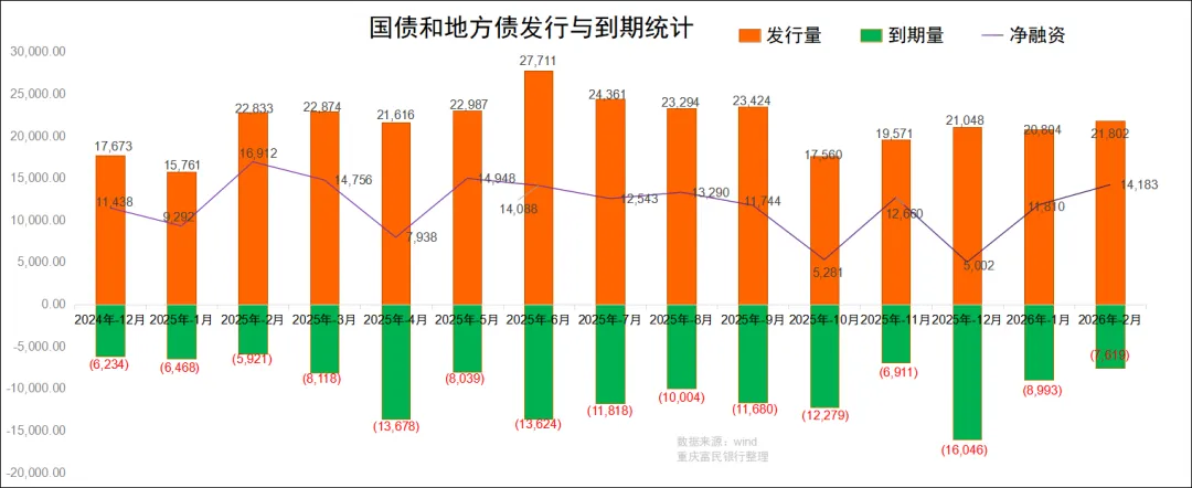 2026年2月,国债和地方债共发信2.18万亿,到期0.76万亿,当月政府债净融资1.42万亿,处于历史较高水平。考虑春节因素,1、2月合计净发信2.6万亿(与2025年1、2月合计量2.62万亿基本持平)。1、2月市场顶住供给压力(可能跟EVE指标2026年放松有关),债市利率整体下行。3月份国债和地方债共有1.5万亿到期,到期量极大,若发行未较2月大幅增长,供给压力或大幅降低。但3月两会财政赤字率大概率保持不变,全年发行总量不减少的情况下也可能主动平滑发行节奏。