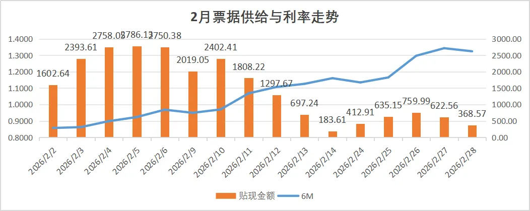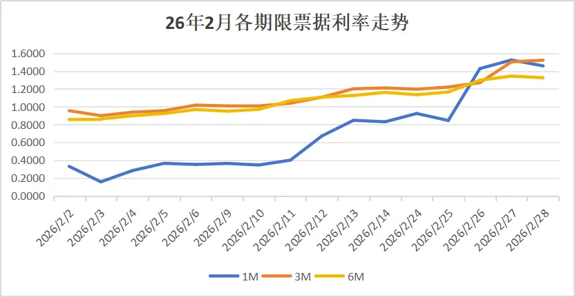 2.1 2月票据利率呈“低开高走,月底最高”的单边向上走势26年2月初,6M双国票据利率大幅低开20bp至0.86%。受低利率影响,单日贴现两保持1600亿,甚至最高突破2700亿。这期间,非银也大幅止盈卖出,第一周净卖出超2629亿。这促使票据利率低开后大幅反弹。第一周足月双国利率即反弹10bp至0.97%。月中第二周,贴现继续保持高位,票据利率继续上行,足月双国利率在春节前上行至1.16%。春节后,市场交投清淡,贴现量保持低位,但配置机构买入不及预期,国有大行由收转出,票据利率进一步上行,足月双国利率月末收于1.32%,为全月最高。月末最后三天,非银净买入超900亿。从2月份转贴现成交情况看:国有行累计净买入2434亿;股份行全月净卖出5550亿,农商行净买入5058亿,非银净卖出1876亿。从表内票据余额看:全部机构类别中,国有行净买入505亿,城商行净减少356亿,农商行净减少374亿,非银减少1975亿。