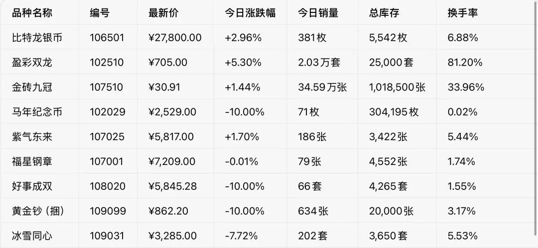 1. 领涨阵营:以比特龙银币(106501)、盈彩双龙(102510)为代表的特色题材品种,延续强势上涨态势,成交量同步放大,资金追捧情绪高涨;金砖九冠(107510)凭借低单价、高流动性优势,实现稳健上涨,成为市场“避风港”。