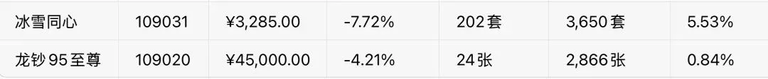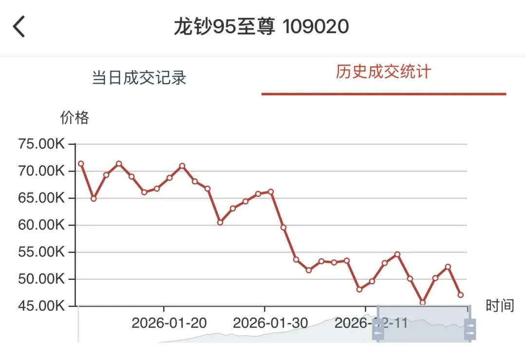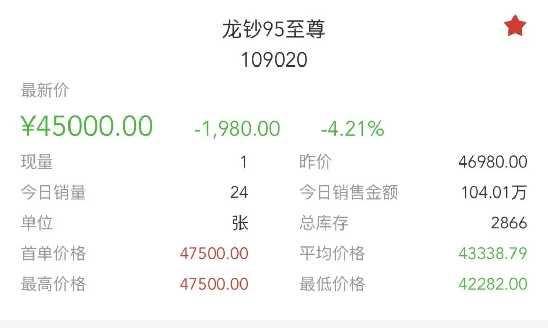 • 当前情况:今日最新价45000.00元,单日跌幅**-4.21%,成交24张**,销售总额104.01万元,总库存2866张,换手率:24/2866 ≈ 0.84%。作为市场最高价品种,今日继续回调,价格从高点75000元大幅回落。