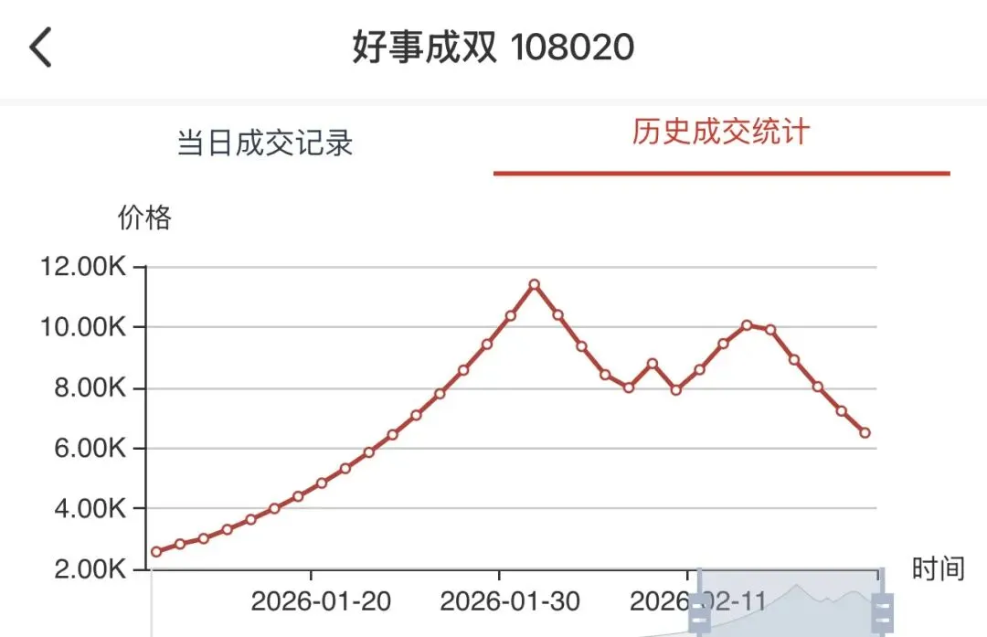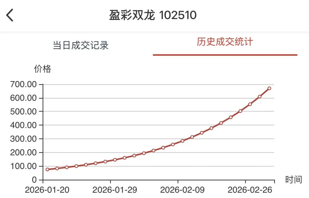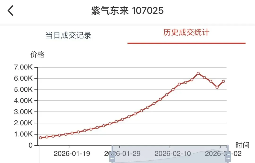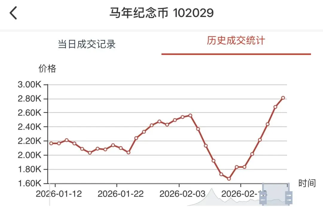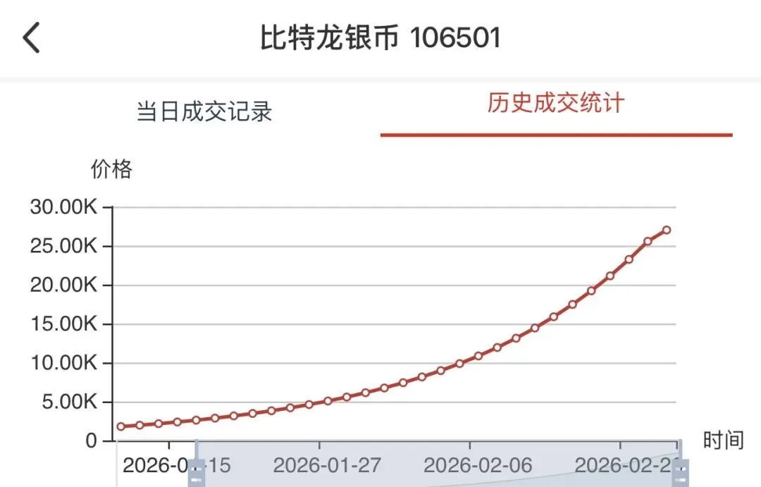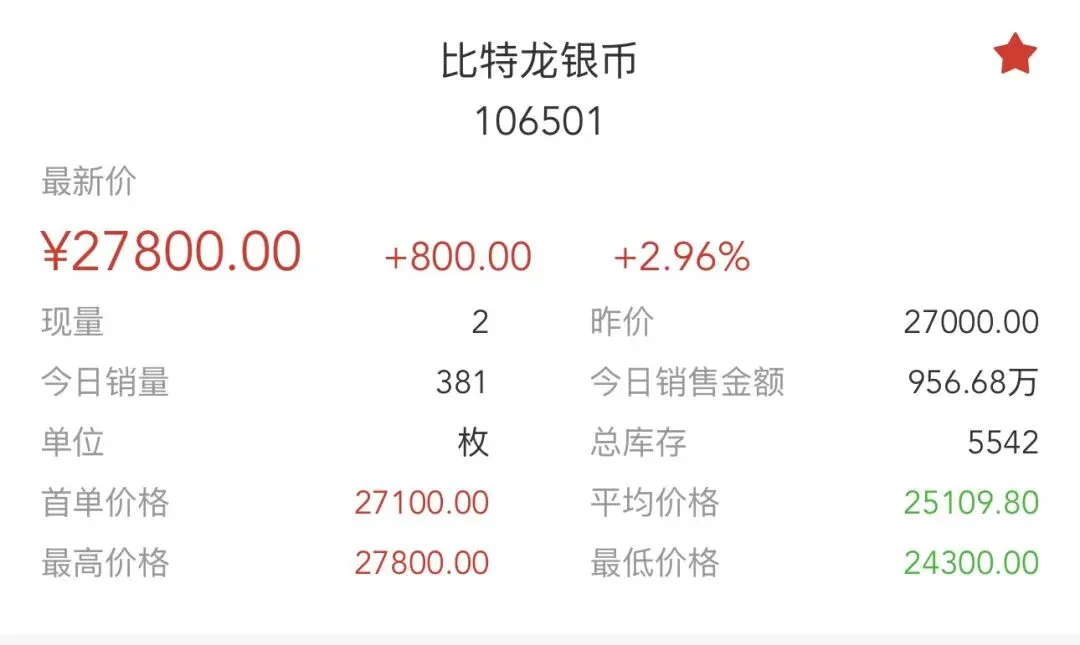 • 当前情况:今日最新价27800.00元,单日涨幅**+2.96%,成交381枚**,销售总额956.68万元,总库存5542枚,换手率:381/5542 ≈ 6.88%。历史走势呈现“单边连涨”格局,自1月中旬以来持续强势,成为市场绝对龙头。