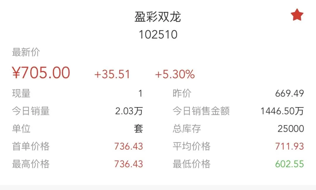 • 当前情况:今日最新价705.00元,单日涨幅**+5.30%,成交2.03万套**,销售总额1446.50万元,总库存25000套,换手率:20300/25000 = 81.20%。价格从602.55元反弹至705元,接近前期高点736.43元。