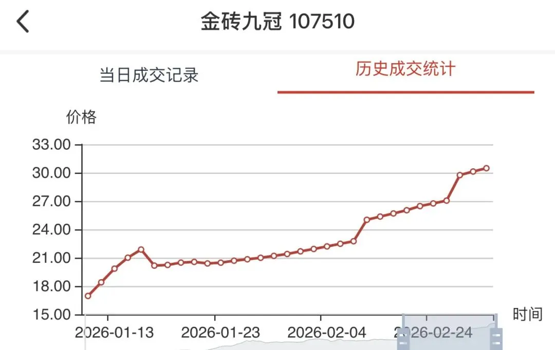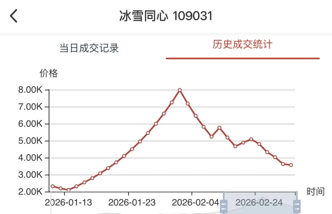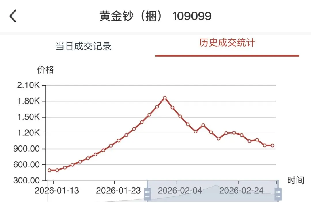 2. 调整阵营:黄金钞(捆)(109099)、马年纪念币(102029)、好事成双(108020)等品种触及10%跌停,冰雪同心(109031)、福星钢章(107001)、龙钞95至尊(109020)也出现不同程度回调,短期获利盘兑现压力显著。