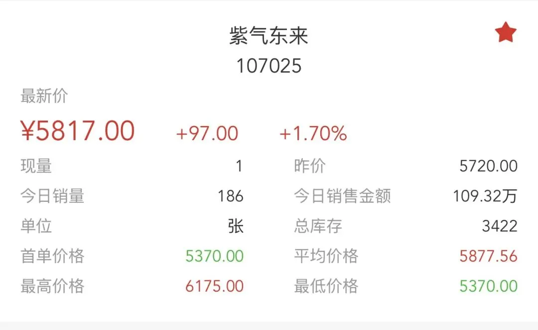 • 当前情况:今日最新价5817.00元,单日涨幅**+1.70%,成交186张,销售总额109.32万元,总库存3422张,换手率:186/3422 ≈ 5.44%。昨日涨停后,今日小幅上涨,价格在5370-6175元区间波动。