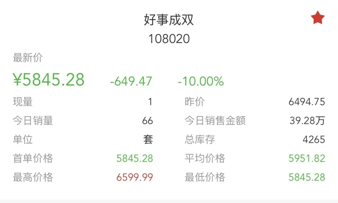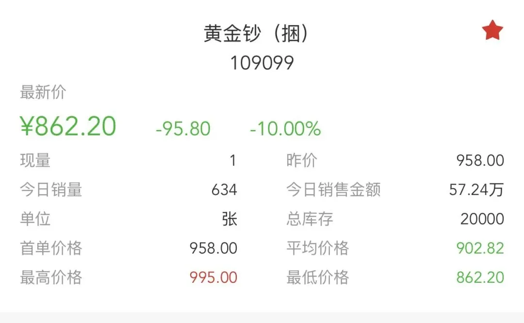 • 当前情况:今日最新价5845.28元,单日跌幅**-10.00%,成交66套**,销售总额39.28万元,总库存4265套,换手率:66/4265 ≈ 1.55%。与黄金钞走势相似,前期冲高后持续回调,今日跌停。