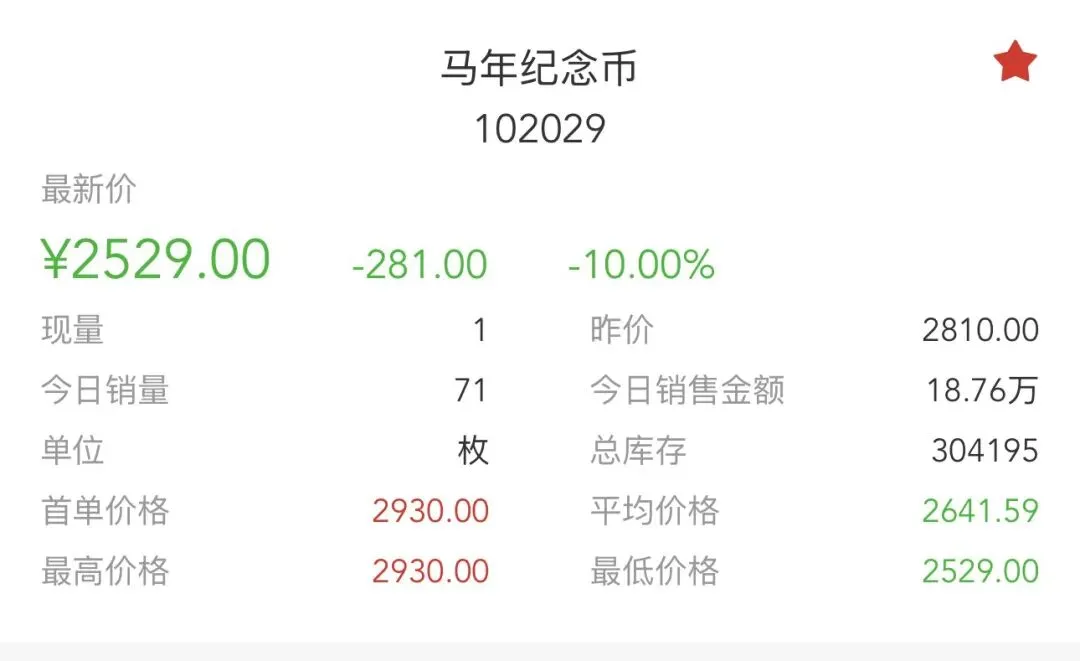 • 当前情况:今日最新价2529.00元,单日跌幅**-10.00%,成交71枚**,销售总额18.76万元,总库存304195枚,换手率:71/304195 ≈ 0.02%。经历昨日强势反弹后,今日跌停,价格从2810元暴跌至2529元。
