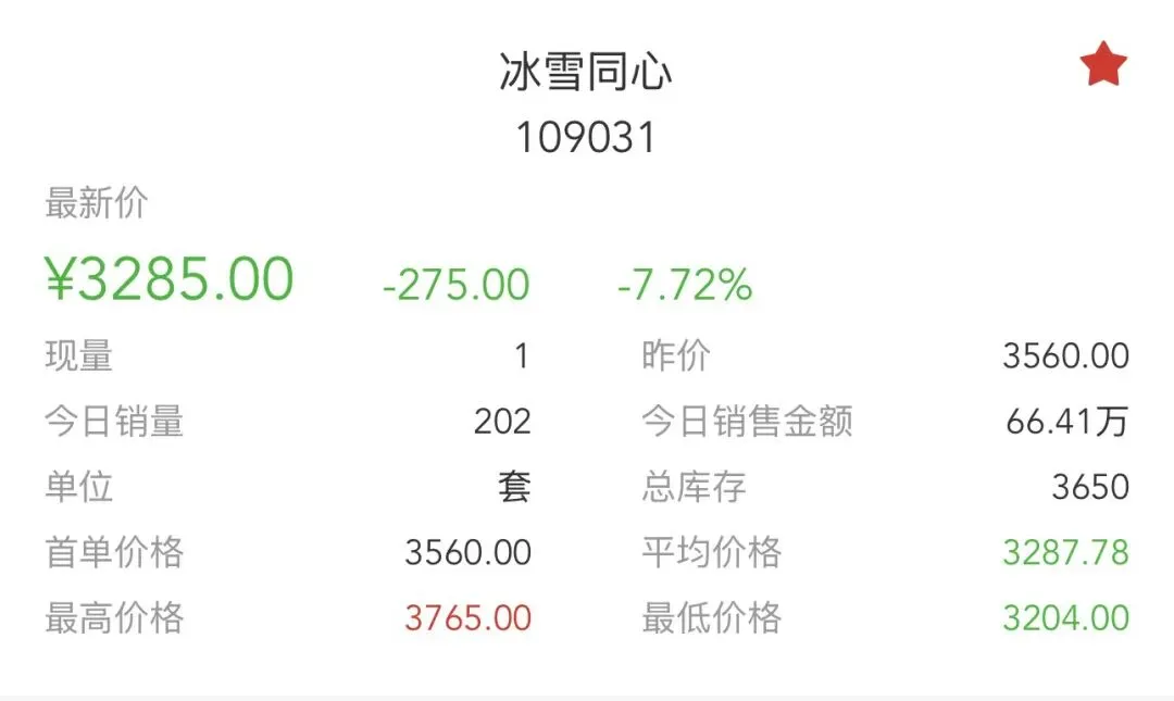 • 当前情况:今日最新价3285.00元,单日跌幅**-7.72%,成交202套**,销售总额66.41万元,总库存3650套,换手率:202/3650 ≈ 5.53%。自2月初见顶后,持续处于回调通道,今日大幅下跌。