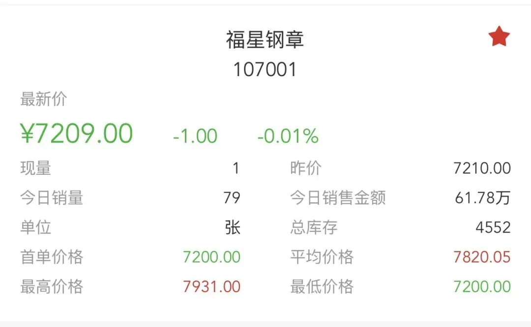 • 当前情况:今日最新价7209.00元,单日跌幅**-0.01%,成交79张**,销售总额61.78万元,总库存4552张,换手率:79/4552 ≈ 1.74%。昨日大幅回调后,今日微跌,价格在7200-7210元窄幅波动。