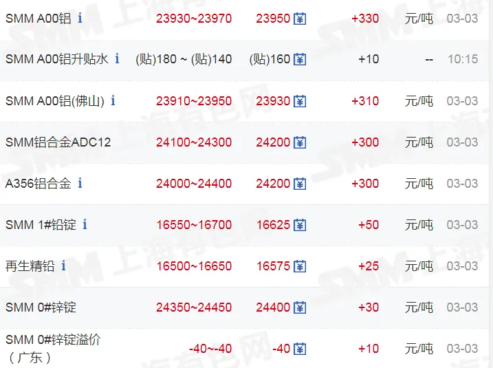 3月3日各大铝锭行情报价