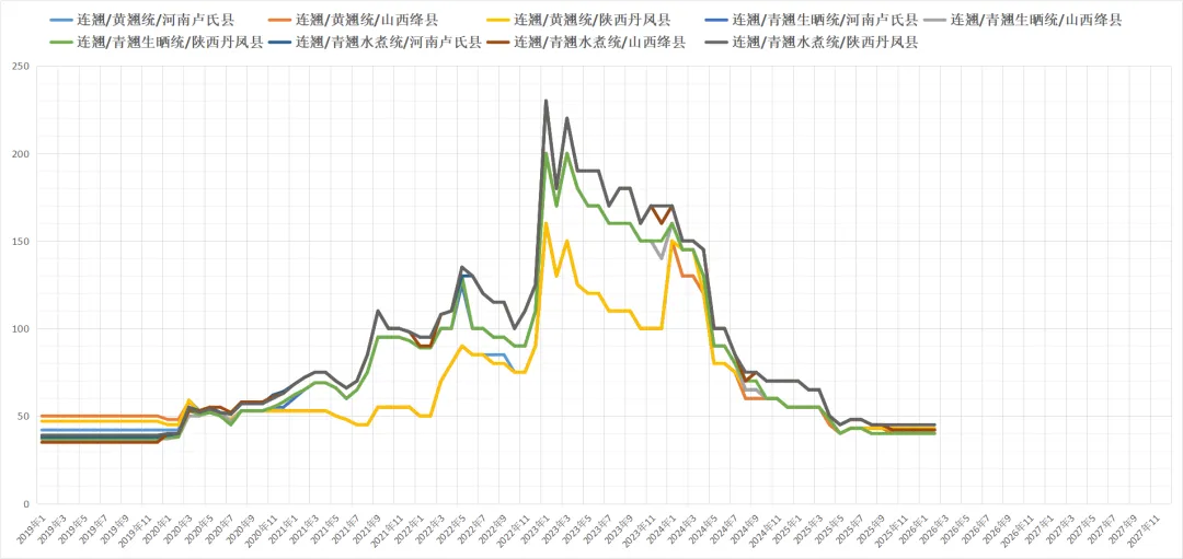 河南省南阳市西峡县连翘年前年后价格基本持平,目前有商询价,但走动一般,现产地青翘挥发油合格的货价格在40-43元之间不等,一般货售价在35-40元之间不等。