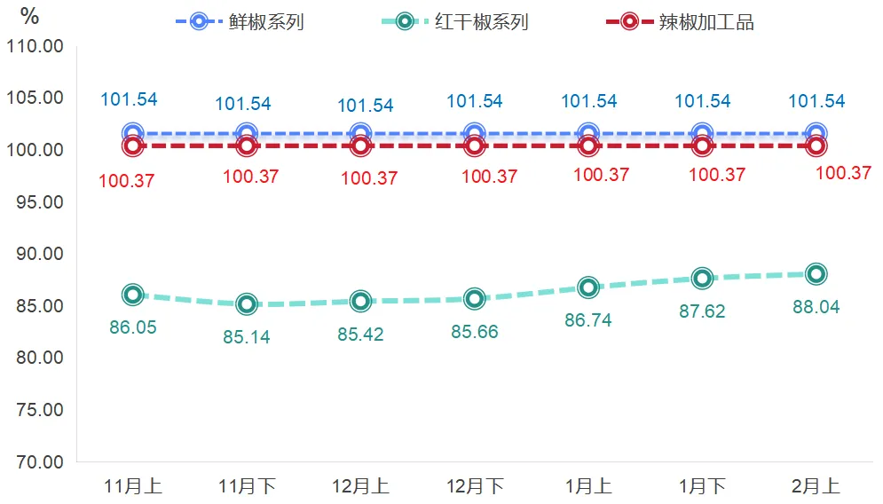 2月上半月,开鲁辣椒产品价格指数收于94.55点,环比上涨0.22%。红干椒系列价格指数上涨0.48%,鲜椒系列价格指数和辣椒加工品价格指数保持不变。