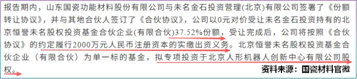 人形机器人领域,国瓷材料以2000万元认购北京恒誉37.52%份额,间接投资北京人形机器人创新中心。