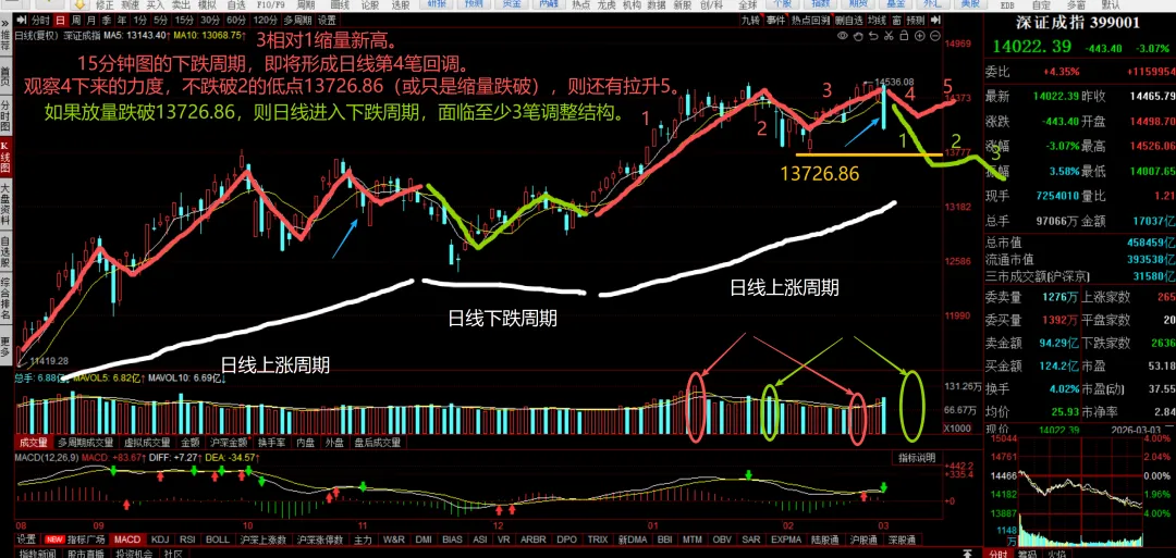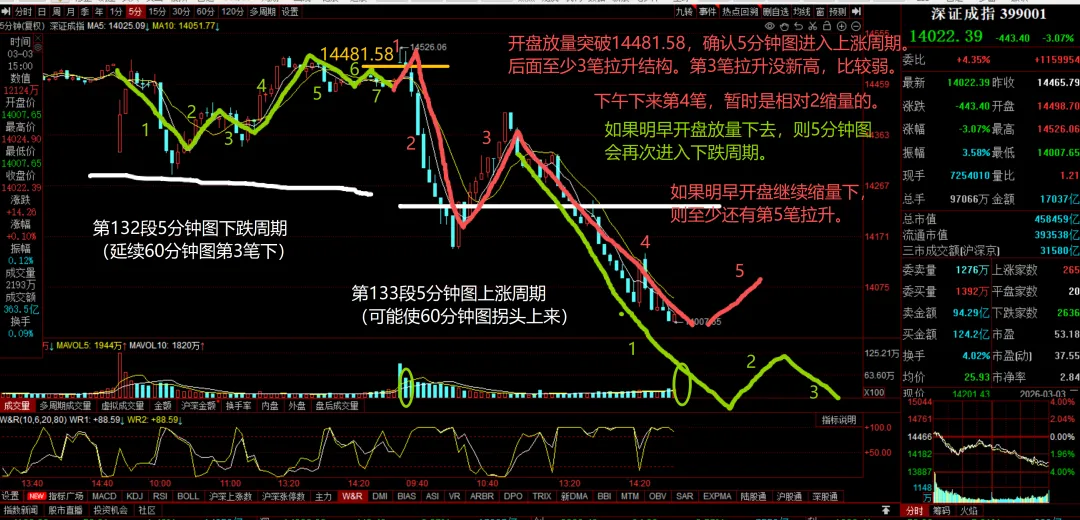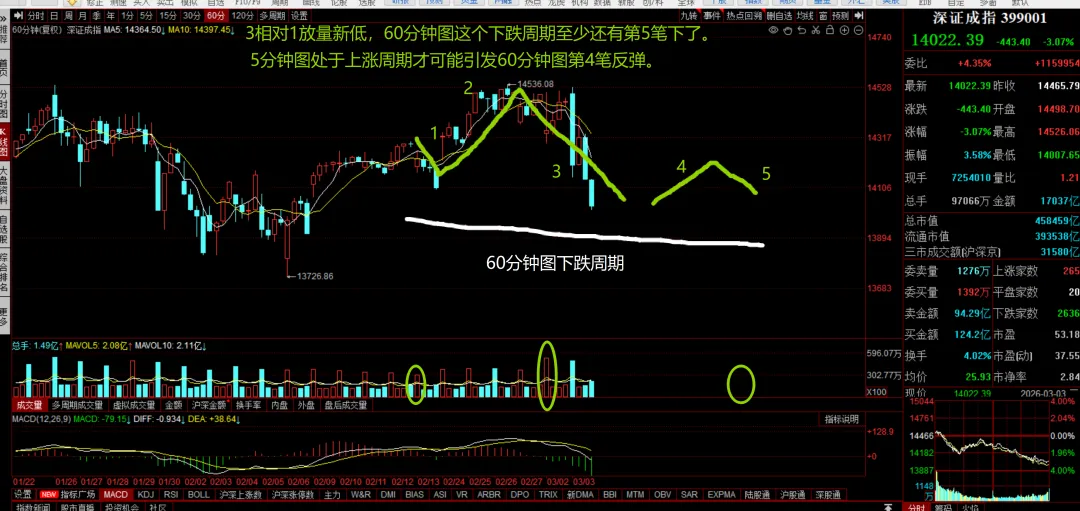 今天继续延续60分钟图下跌周期第3笔下,并且放量跌破第1笔低点14092.84,后面至少还有第5笔下了。