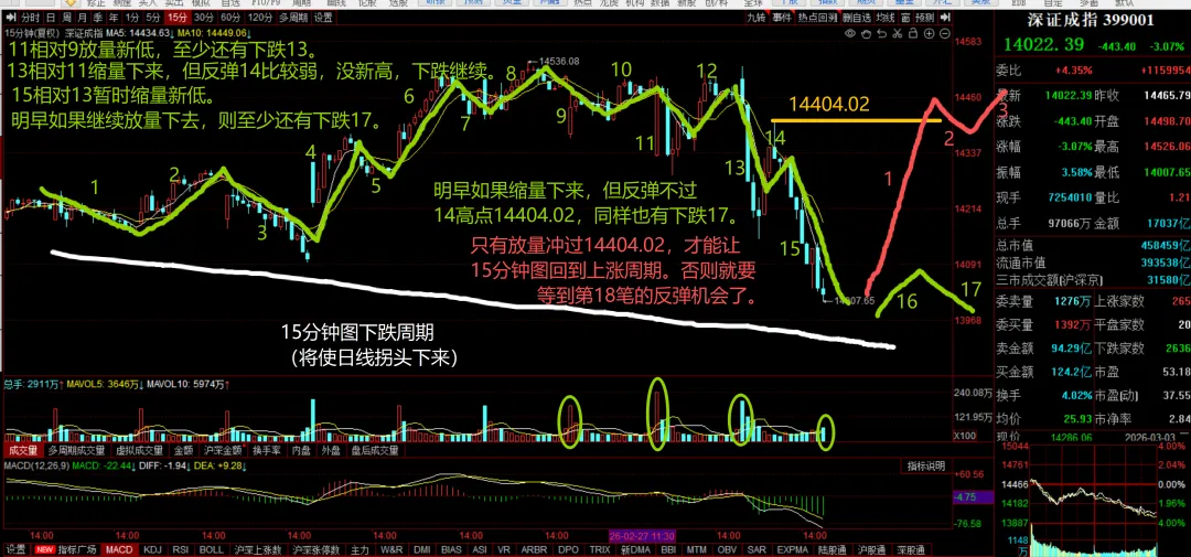 明天如果能放量冲过14笔高点14404.02才能让15分钟图回到上涨周期。但如果开盘继续(相对今天开盘)放量下去,则至少还有第17笔下了。