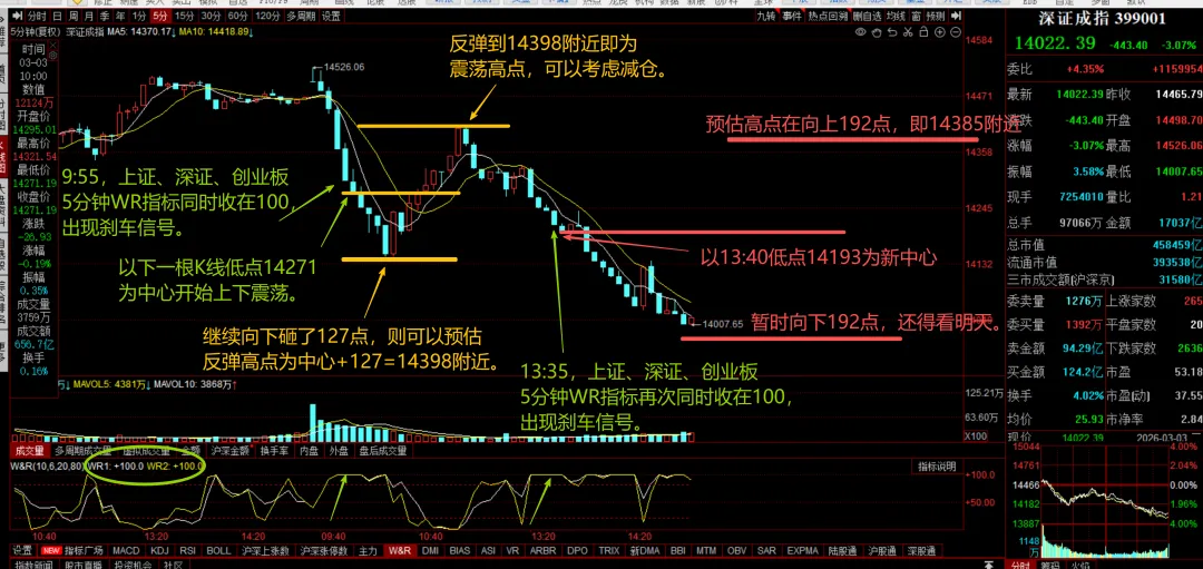 下午13:35再次出现上证、深证、创业板5分钟wr同时贴住100的信号。那么新的震荡就可以以13:40的低点14193.3为中心开始计算。当然,你也可以始终以早上第一个信号为中心来计算。