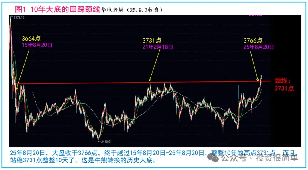 如图1所示,25年8月20日,大盘收于3766点,终于越过15年8月20日-25年8月20日,整整10年的高点3731点。而且,站稳3731点整整10天了。这是牛熊转换的历史大底。