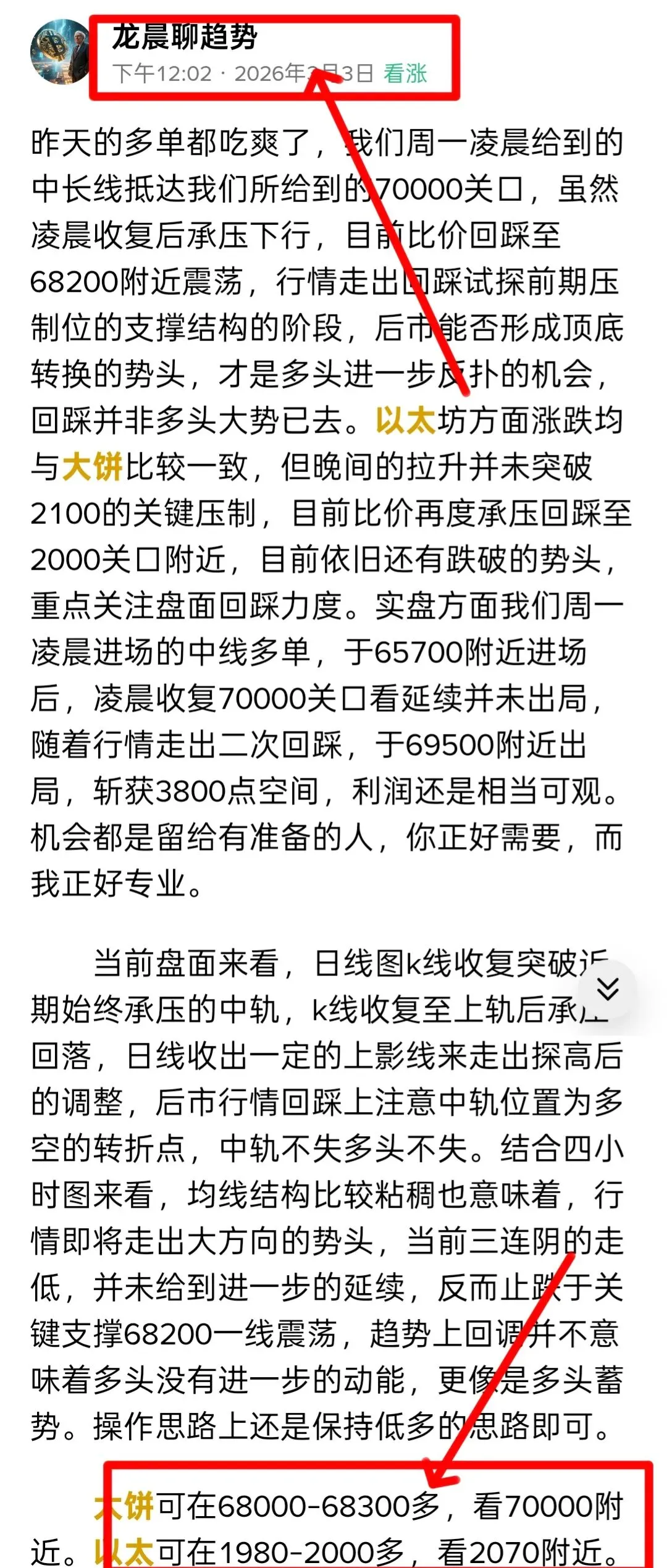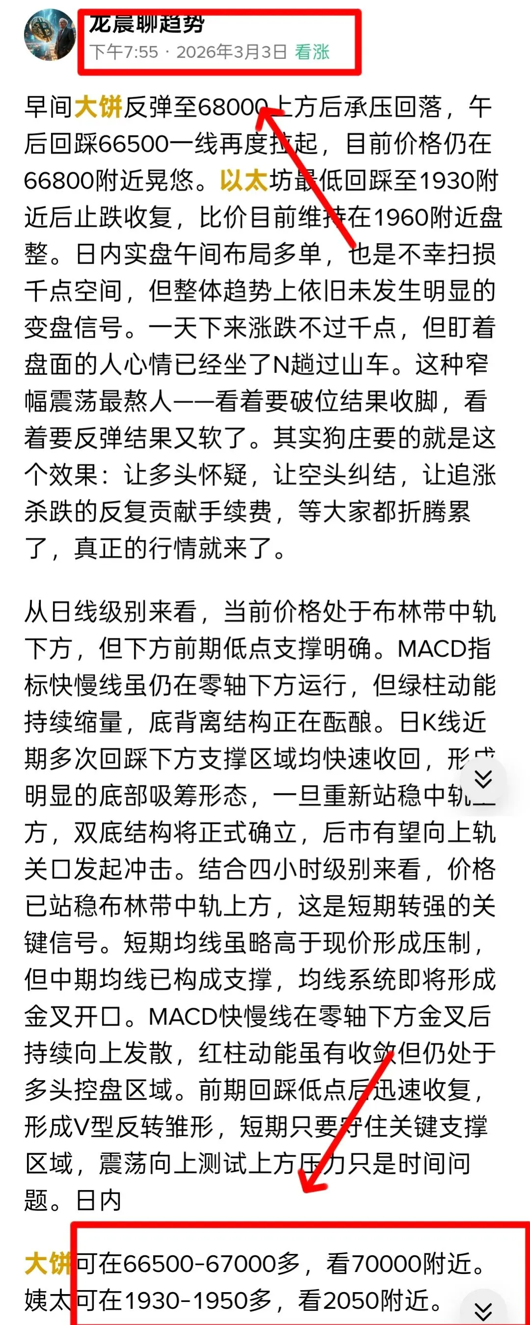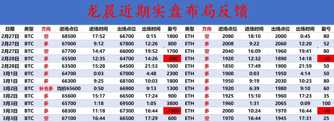 今天这行情走的那叫一个标准的“早盘诱多、午后阴跌、晚间加速”。早间大饼还在69000上方晃悠,看着要向上突破了,结果午后就开始软绵绵地往下出溜,晚间直接插针到66000附近才勉强稳住。以太就更惨了,早盘还在2050上方装模作样,午后就扛不住了,晚间一度跌破1930附近止跌。一天下来,多空来回扫,其实狗庄要的就是这个效果,让你觉得要突破了结果就是假突破,让你觉得要崩了结果又给你拉回来,来来回回就是不让大家好好赚钱。等折腾累了,真正的方向才会出来。而我们日内的实盘布局上坚持看涨思路,虽然日内小有扫损一千点空间,但我们日内保持上看思路仍旧拿下一定利润,大饼结合长线布局落袋4200点空间,姨太扫损一点总计落袋105点。周二晚间低位多单依旧持有当中。