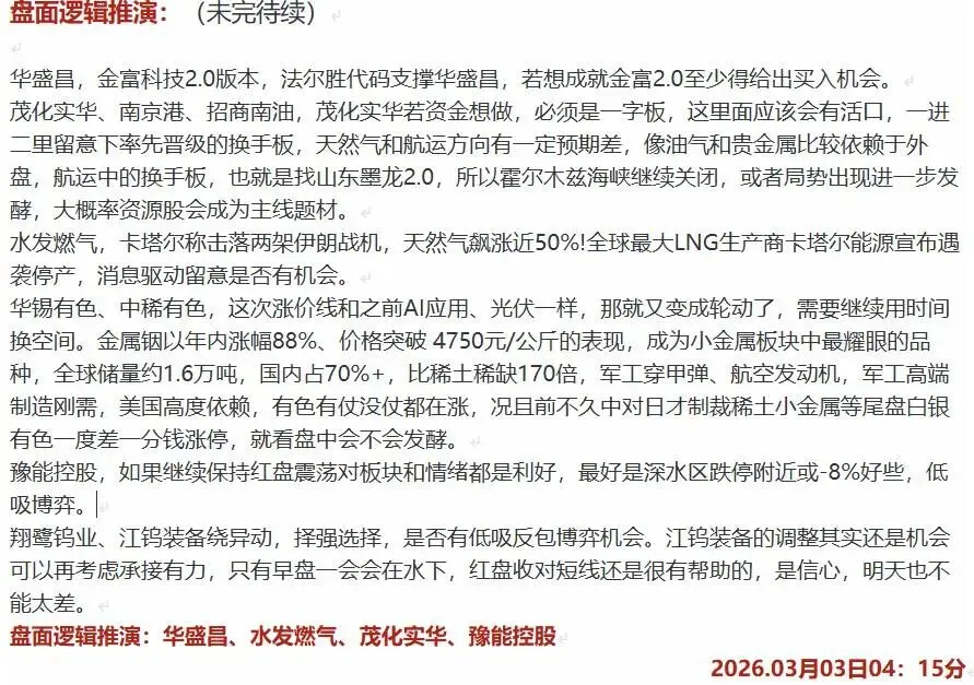 AI:大科技线,这个方向更不急了,目前市场聚焦能源周期,科技股包括其他的题材都是靠边站,这个方向是需要增量资金炒作起来的,等待情绪的转折点再去布局就行了,目前不着急。算力方向随着豫能炸板,补涨龙泰嘉也炸了,华盛昌卡位又炸,这都表现出偏弱的感觉,所以龙头豫能后面的一泻千里也不意外。