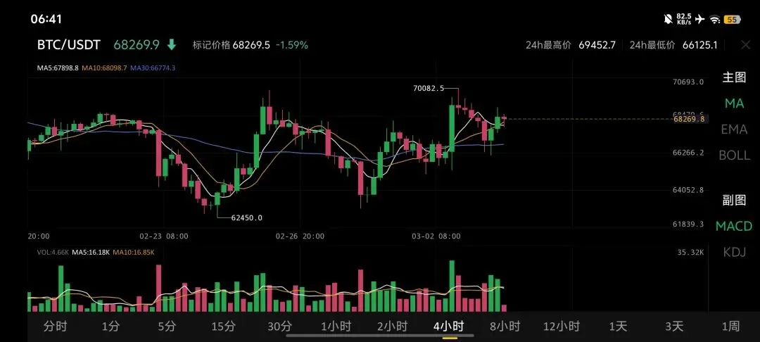 当前价格 68269.9 USDT,日内小幅下跌 1.59%。价格位于昨日高点 69452.7 和低点 66125.1 之间运行,呈现高位震荡整理格局。