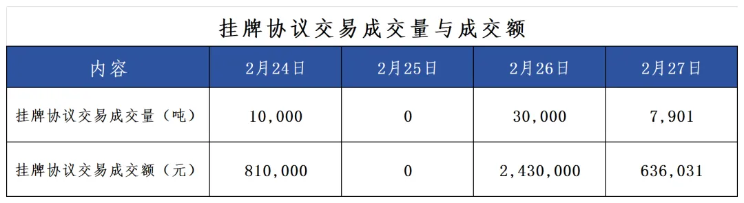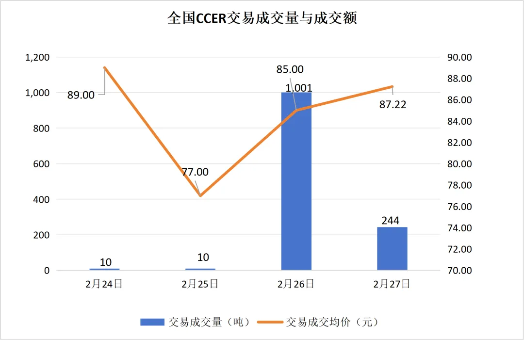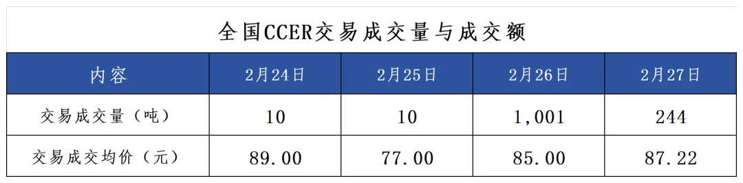 由于春节期间(2月15日至2月23日),全国碳市场休市。2月24日正常开市。2月24日至2月27日,当周共有4个交易日。当周挂牌协议交易仅在25日无成交量,其余交易日均有成交量;大宗协议交易仅在24日无成交量,其余交易日均有成交量;本周无单向竞价。当周碳价呈稳定趋势,最高价81.00元/吨,最低价80.50元/吨,收盘价较上周五上涨2.89%。本周总成交量947,901吨,相比上一交易周大幅下跌。当周全国CCER价格较为波动,最高成交均价89.00元/吨,最低成交均价77.00元/吨。周五成交均价为87.22元/吨,较上一个交易周的周五成交均价85.50元/吨轻微上涨。当周全国CCER成交总量为1265吨,较上一交易周的105,373吨下降98.80%。截至2026年2月27日,全国温室气体自愿减排交易市场累计成交10,623,782吨,累计成交额759,082,970.57元。上周仅上海、湖北、广东、深圳4个区域碳市场有配额成交,交易总量为54325吨。其中,广东碳市场活跃度最高,当周成交量达到了27001吨,上海、深圳碳市场成交总量上周分别居于第二和第三。