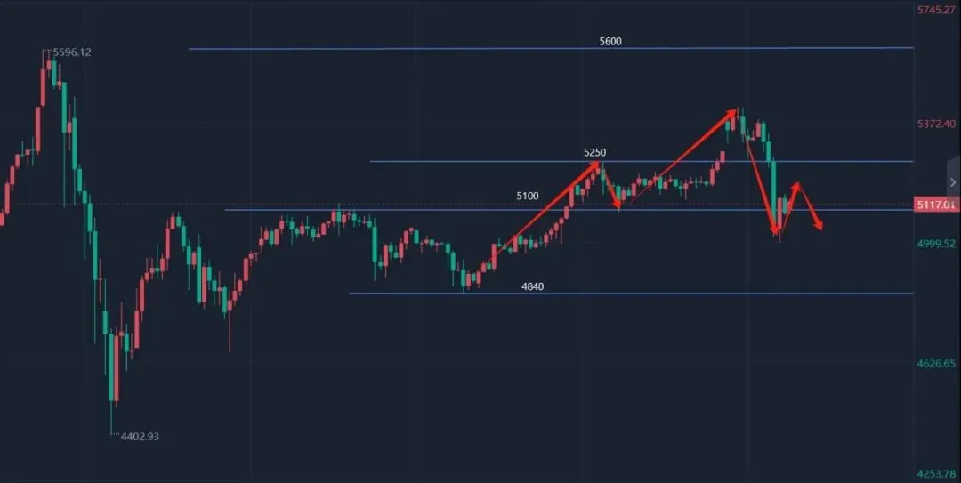 1.昨日周二黄金走势:开盘5324,先拉升破5350至高点5379,随后连续崩盘下跌,途中多次反抽诱多(如反弹5375、5323、5287、5070等),多空反复拉锯,最低下破5000大关至4996,尾盘触底回升,最终收盘5088。